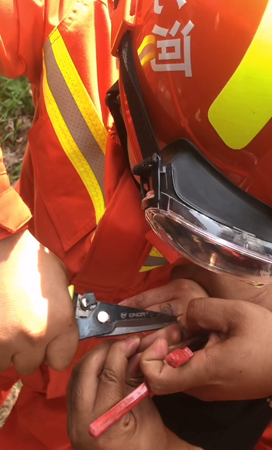 救援人员了解情况后迅速展开救援。为防止男孩手指二次受到伤害,救援人员先先用钥匙垫在戒指与手指之间并用浸湿的毛巾覆盖在手指周围保护男孩的手指,随后边用角磨机切割边用冷水降温,经过细心操作,戒指被切断,救援人员随后用两把钳子夹开戒指,然后用一枚钥匙垫在手指下方,顺着钥匙将戒指取出。
