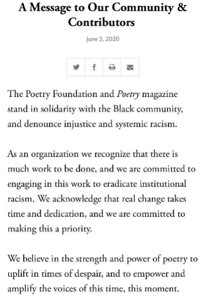近日,美国诗歌基金会发布了简短的声明,声明中表示要“团结黑人社区”, “作为一个组织,我们有许多的工作要做”,“真正的变革需要时间与付出”,而与此同时 ,“我们相信在绝望的时候,诗歌的力量可以让我们得到升华,让我们在此时此刻发出更大的声音”。