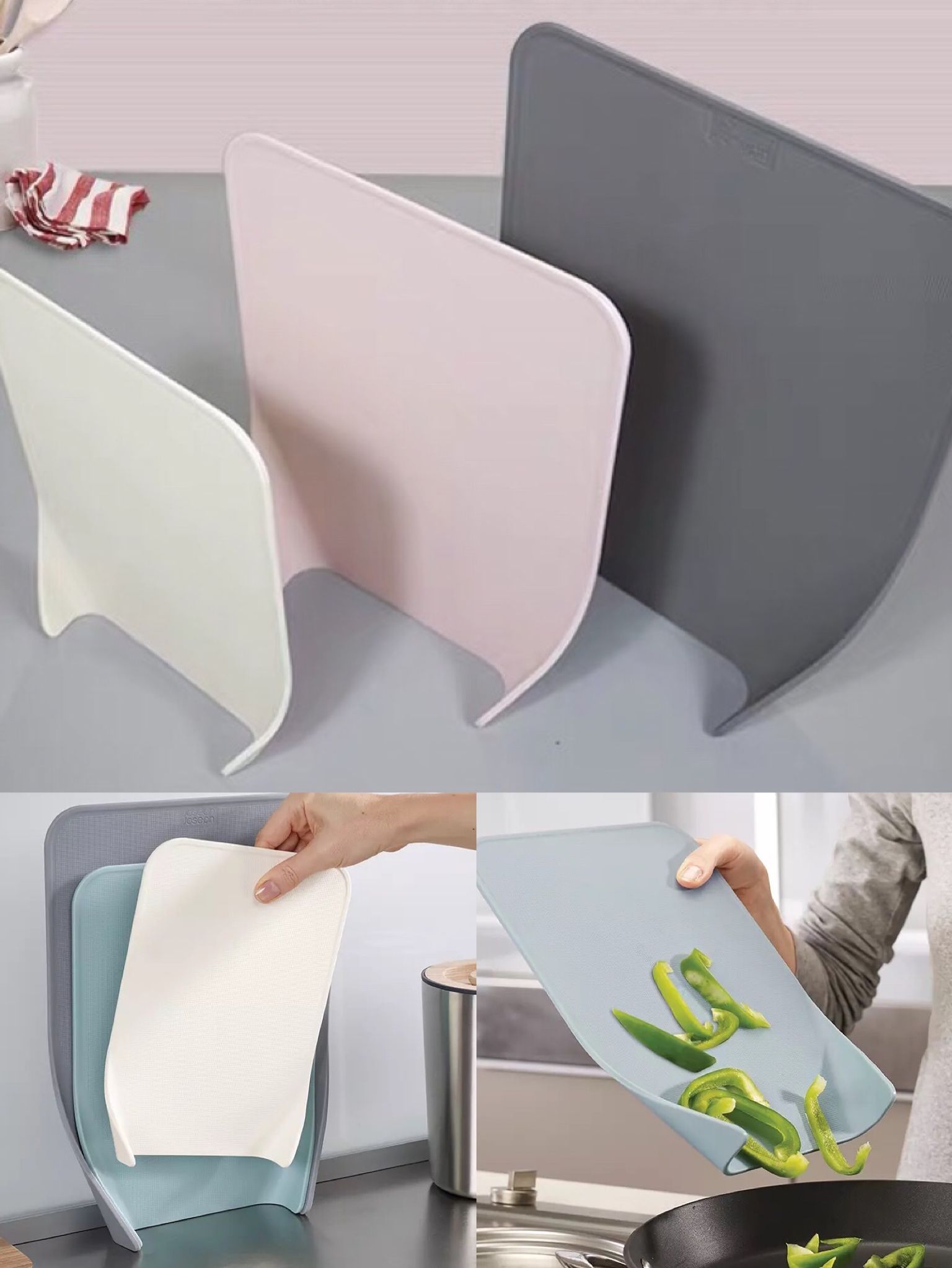 潮湿的夏天,清洗后的砧板一定要晾干才能保持清洁卫生。这款Joseph Joseph的砧板就能自己“站住脚”,方便晾干收纳。下部的卷边设计不但是它站稳的基础,切菜后也可以十分方便地倒进炒锅。不在厨房墙面上钉钉子、粘挂钩,这套砧板真心做到了“不扶墙就服它”。