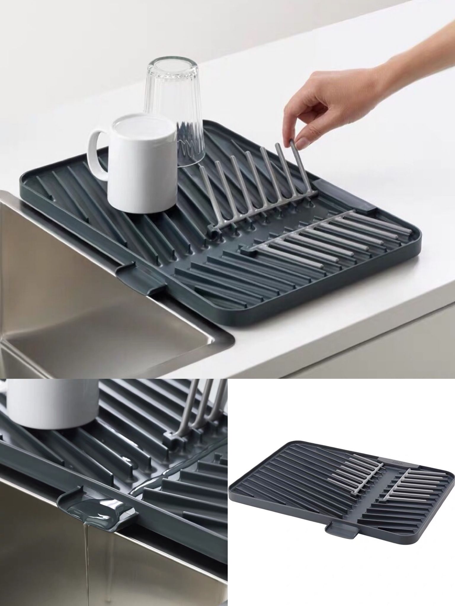 各种碗碟杯盘,一架搞定。这个支架,立起来可以一次性沥干6个盘子,放下去则可以放杯子、碗。独特的引流槽设计,可以让碗架中的积水直接引到排水口、流进洗碗池。防滑的底垫在使用时也更加稳固。
