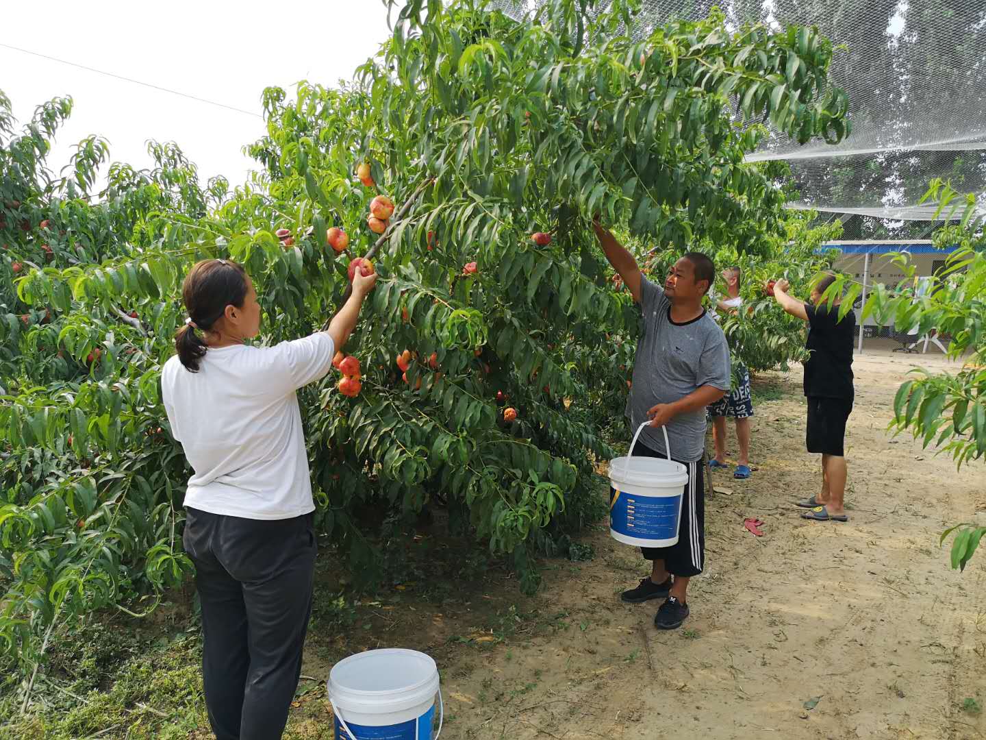 眼下,正是桃子成熟的时节。在枣强县新屯镇宫杨兴村的180亩油蟠桃园里,一个个分量十足、色泽红艳的油蟠桃挂在枝头,甚是喜人。本村及附近村的乡亲们正手脚麻利地进行采摘、装箱。