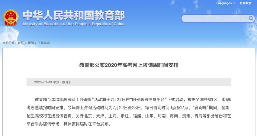 考生可通过教育部“阳光高考信息平台”网页及微信公众号等方式参与咨询周活动。同时,为提高咨询效率,请考生提前浏览各高校发布的最新招生信息,了解相关情况。