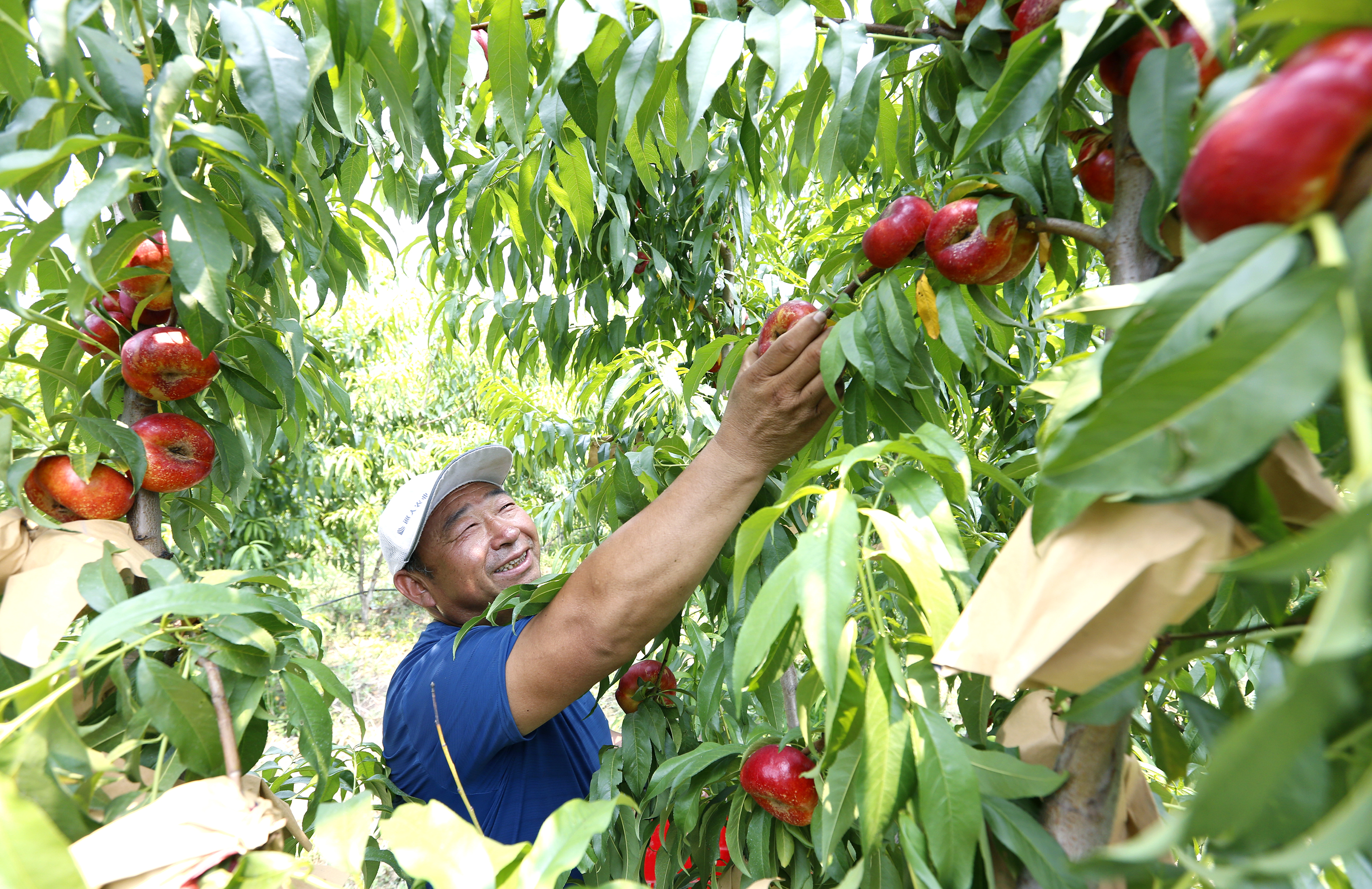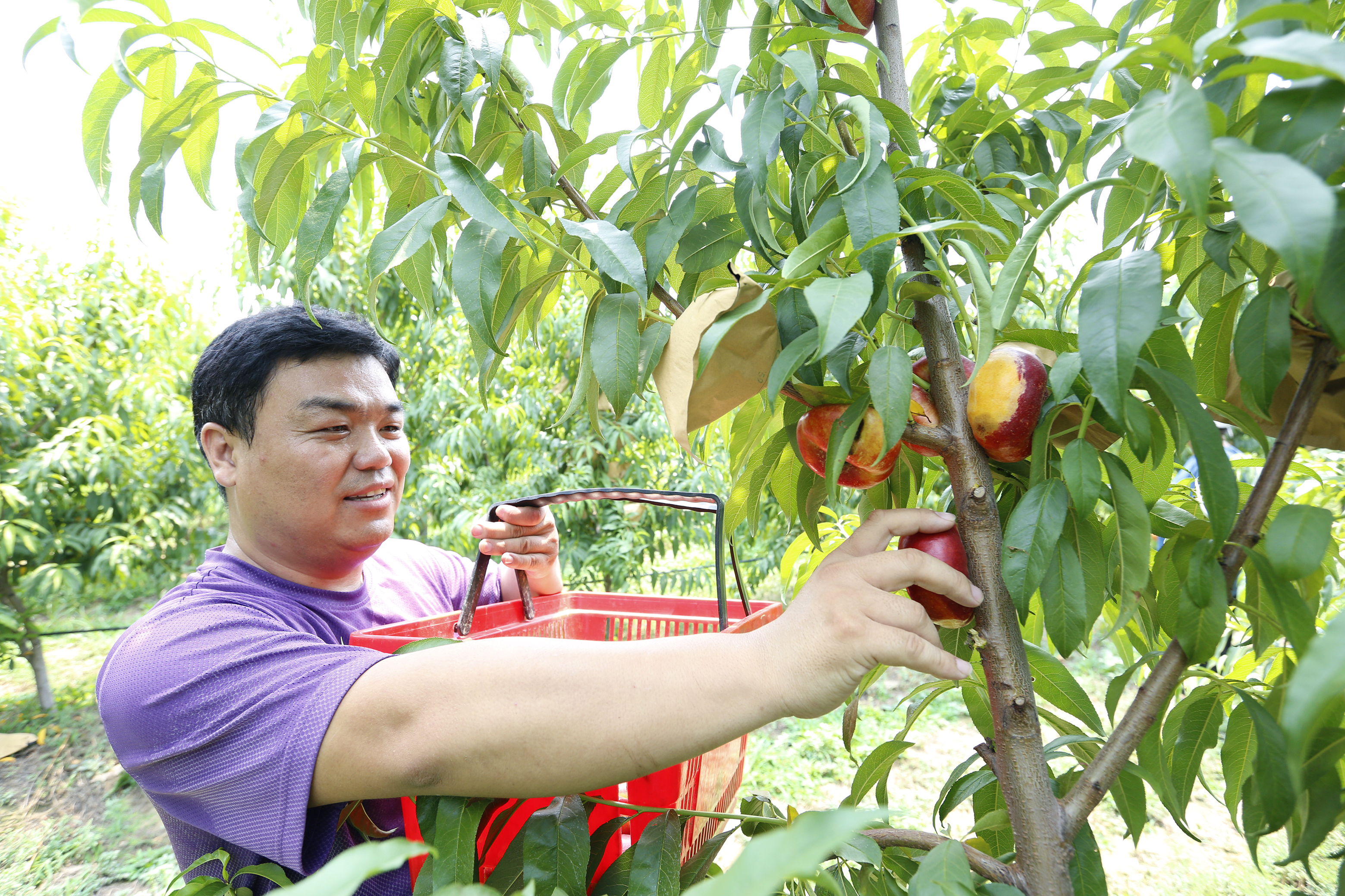 游客在故城县东大洼现代农业园区梅颂园蟠桃种植园内采摘蟠桃。