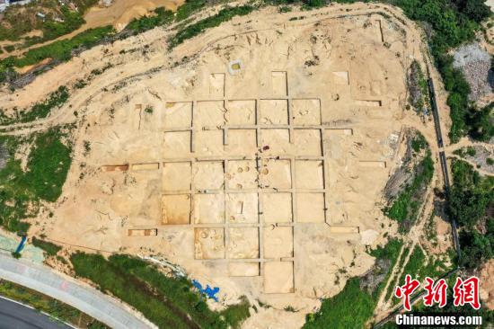 7月14日,航拍位于广东省广州市的中新知识城北起步区马头庄先秦遗址。广州市文物考古研究院13日通报,中新知识城北起步区马头庄先秦遗址抢救性考古发掘,目前共清理新石器时代晚期、两周时期墓葬65座,出土陶鼎、陶豆、陶器座、石铲、石环、玉玦等文物107件/套。 (中新社记者 陈骥旻 摄)