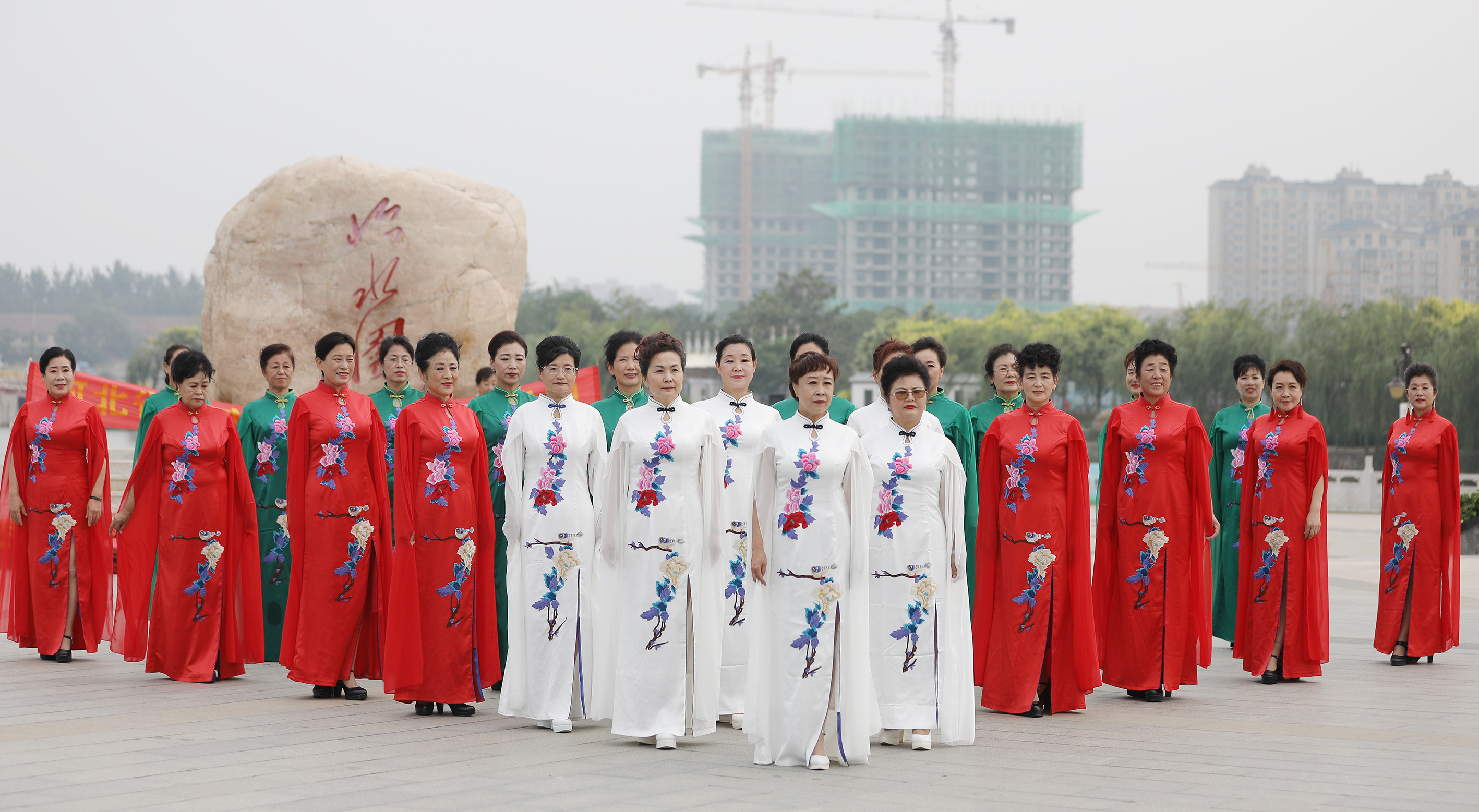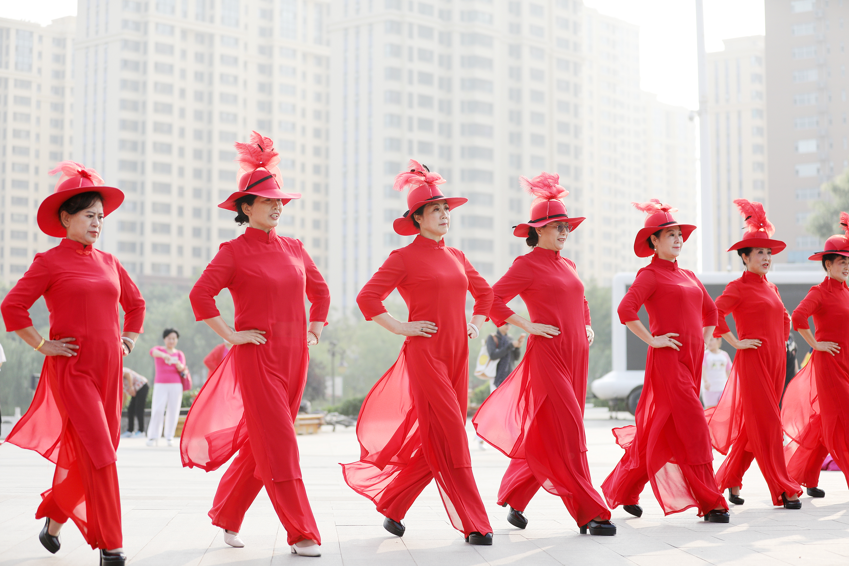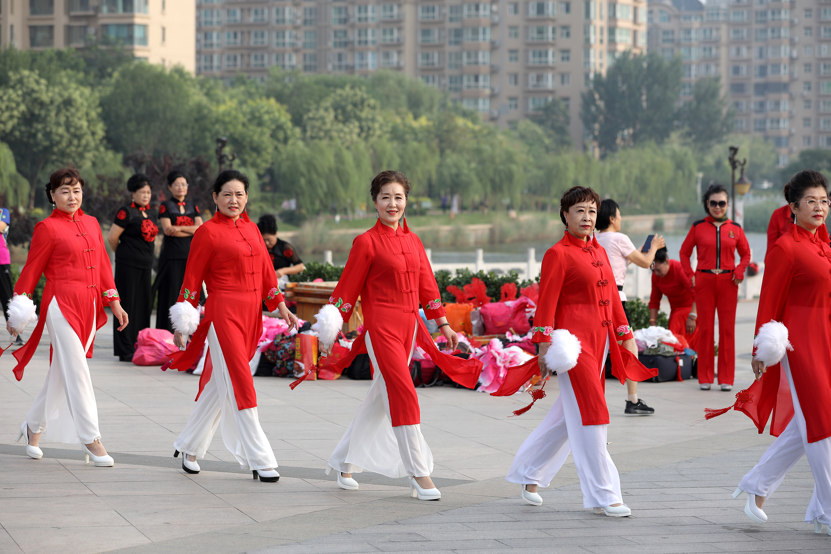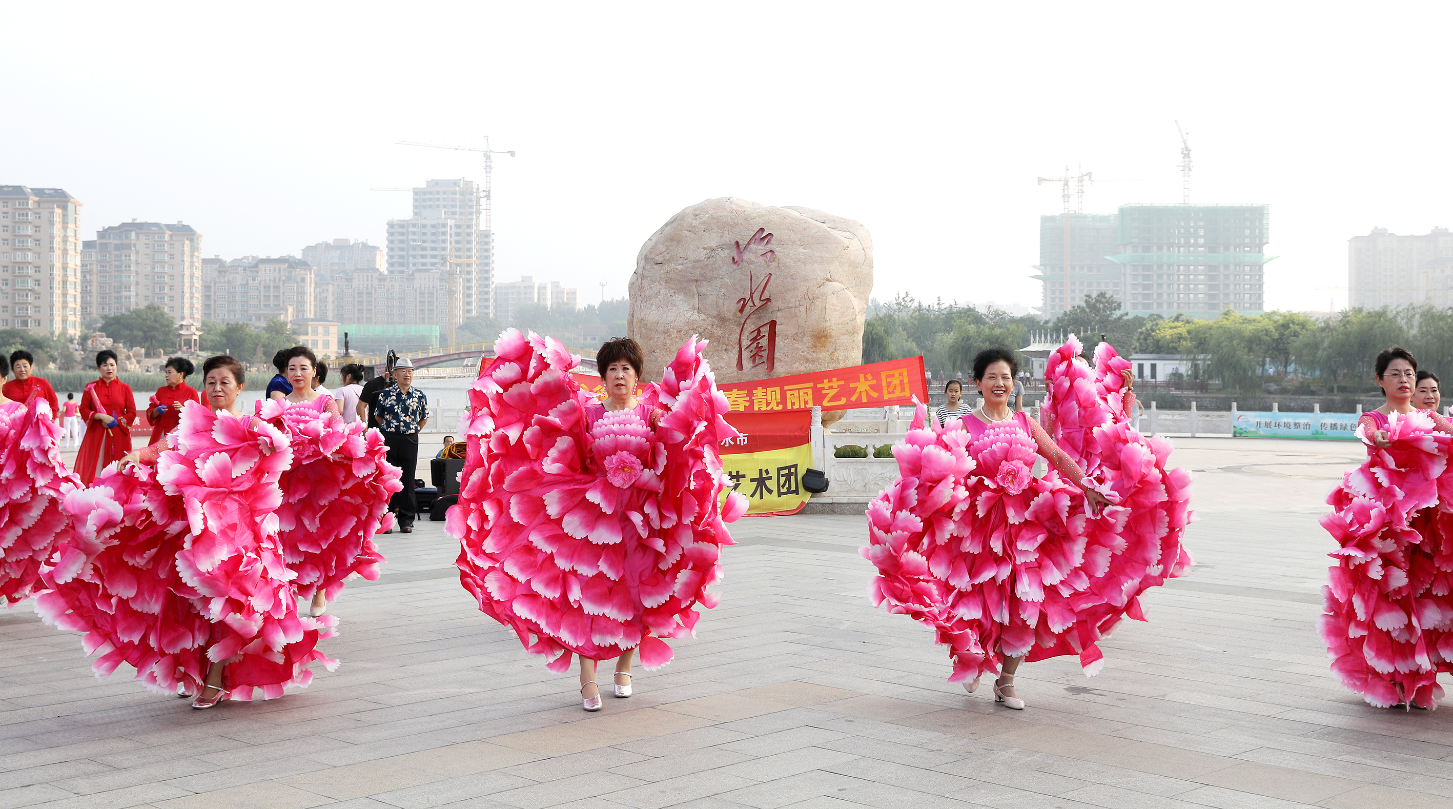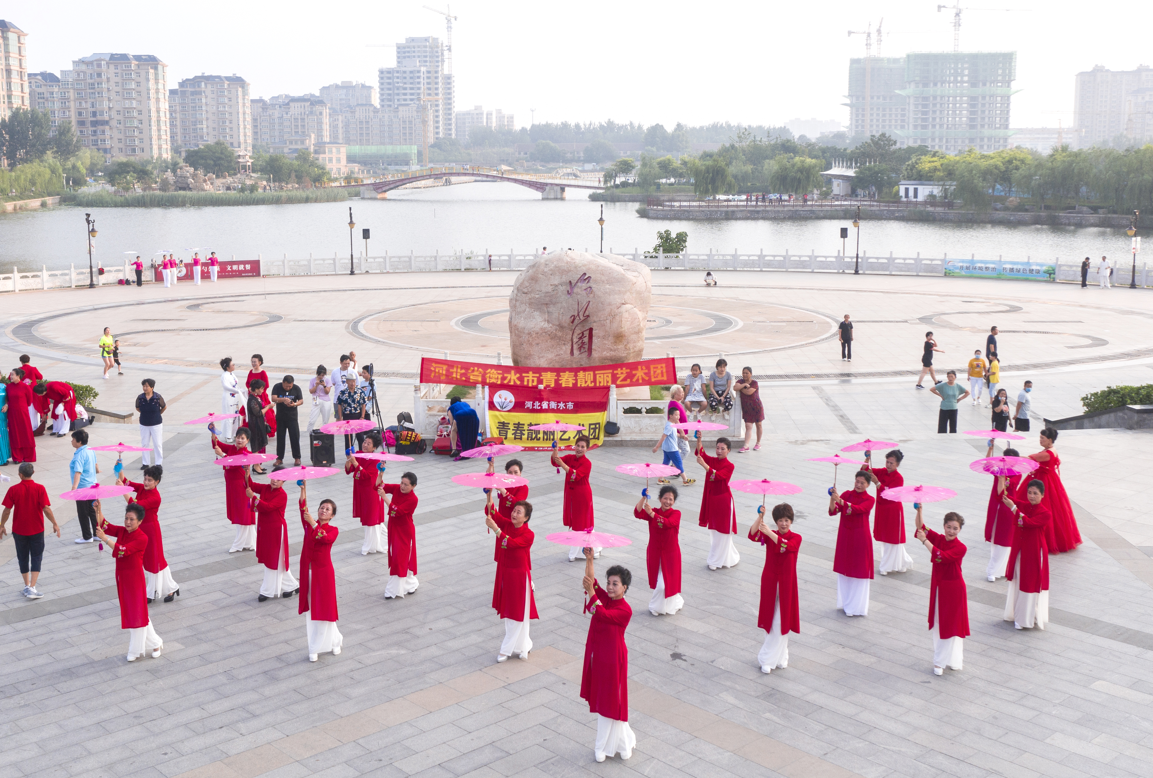 衡水市青春靓丽艺术团的老年队员在怡水园广场上表演。(无人机照片)