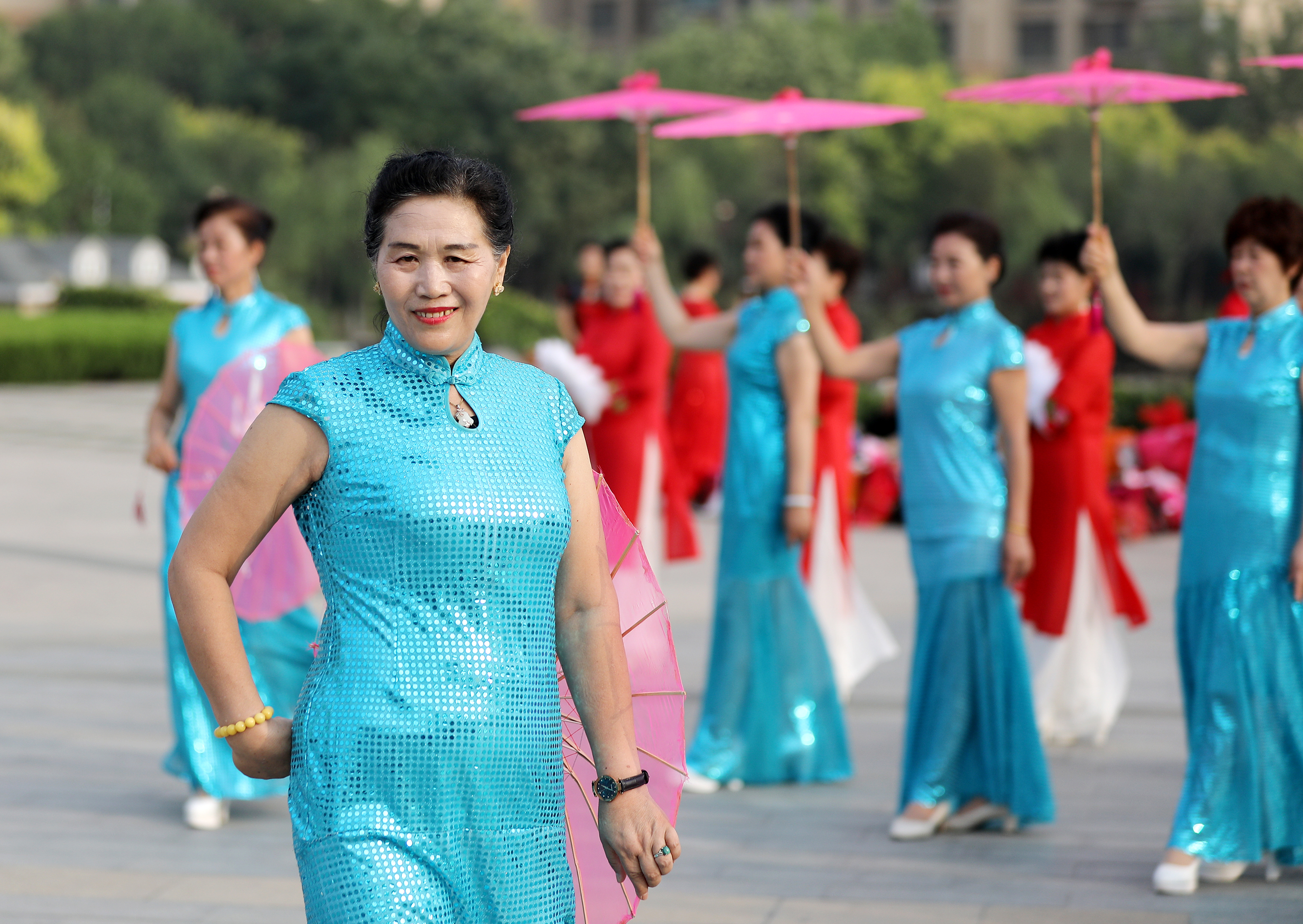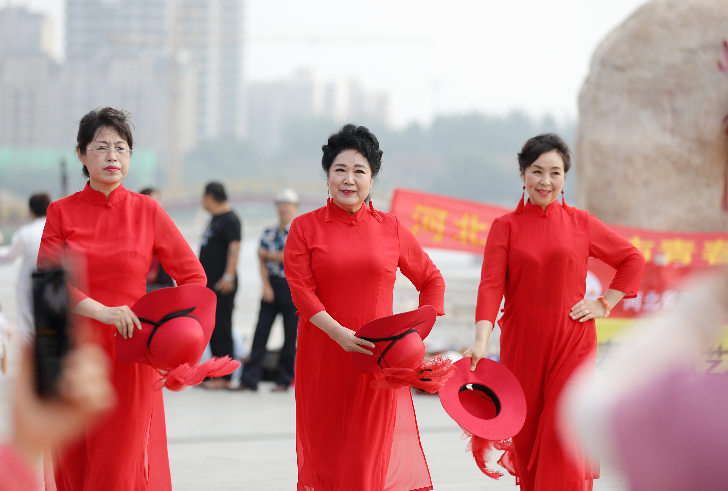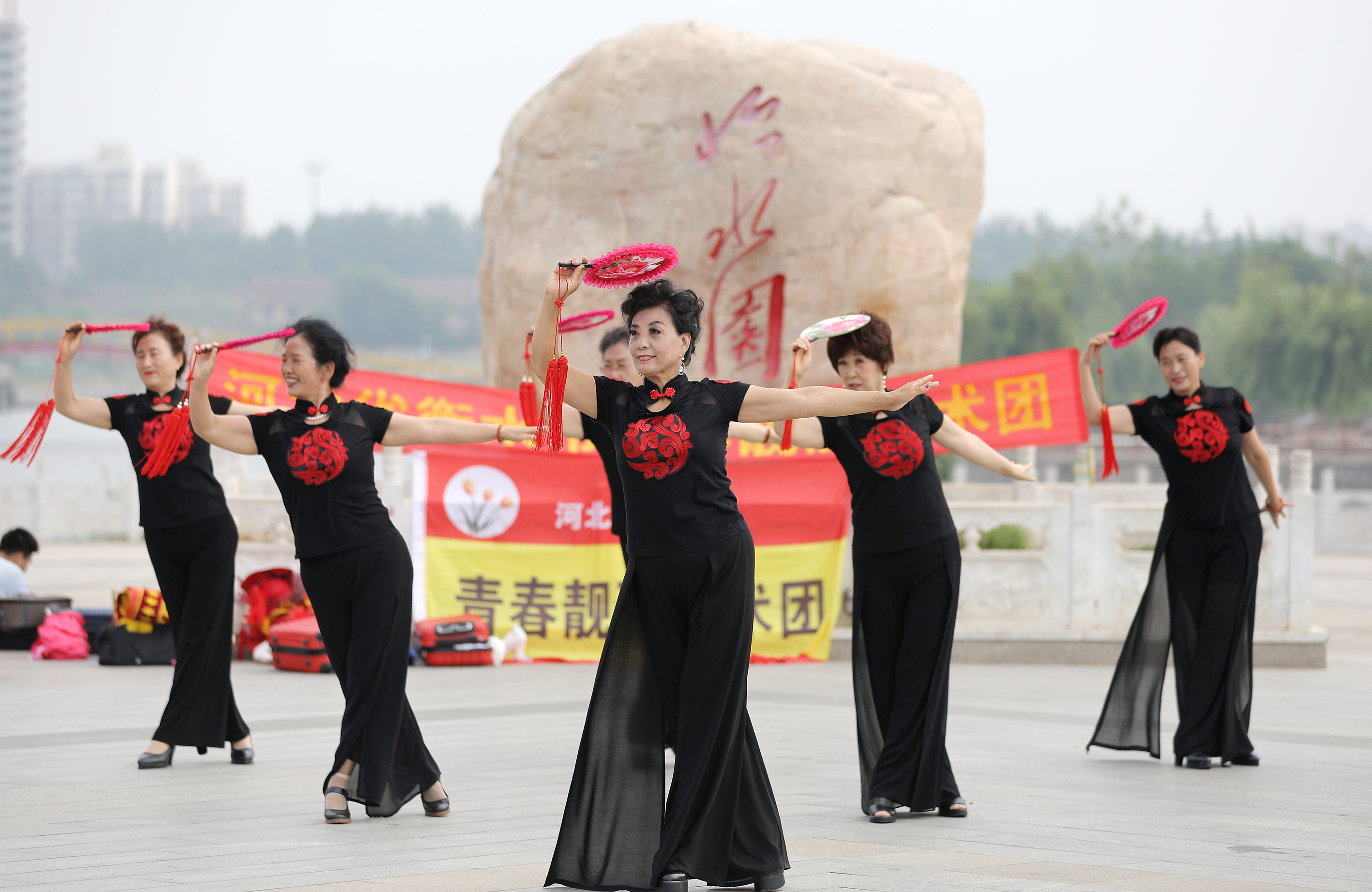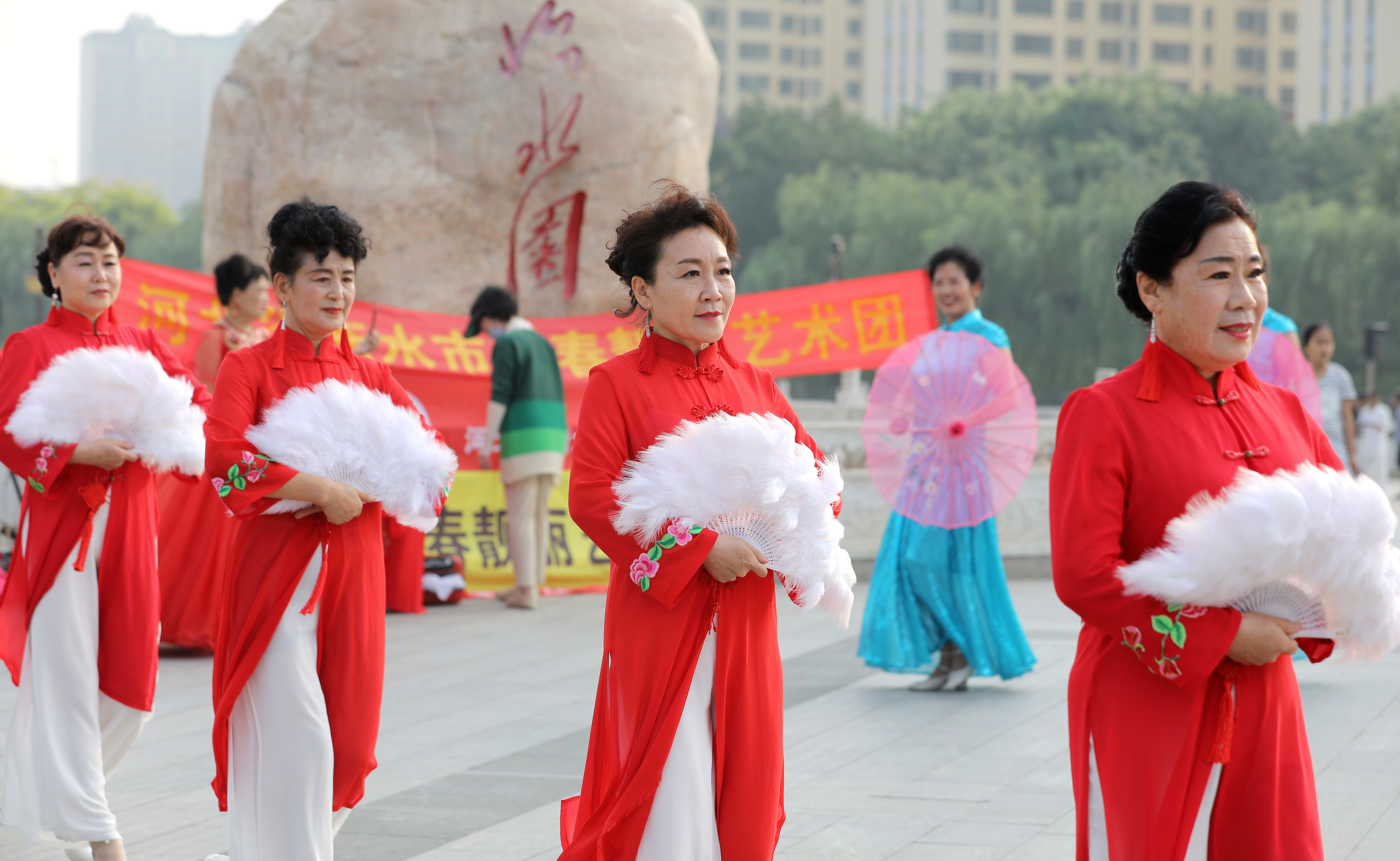 衡水市青春靓丽艺术团的老年队员在怡水园广场上表演。
