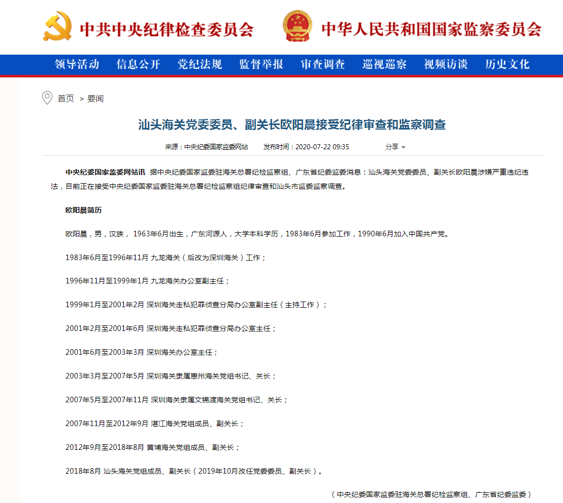 据中央纪委国家监委驻海关总署纪检监察组、广东省纪委监委消息:汕头海关党委委员、副关长欧阳晨涉嫌严重违纪违法,目前正在接受中央纪委国家监委驻海关总署纪检监察组纪律审查和汕头市监委监察调查。