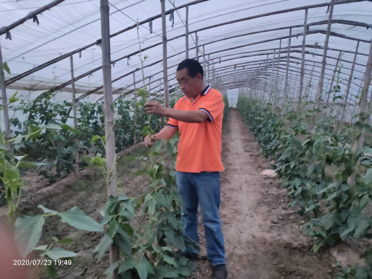 戴上头灯,提上水,7月22日晚8时许,趁着夜里气温低,温彦洲和妻子又到自家大棚给茄子打叉掐尖。