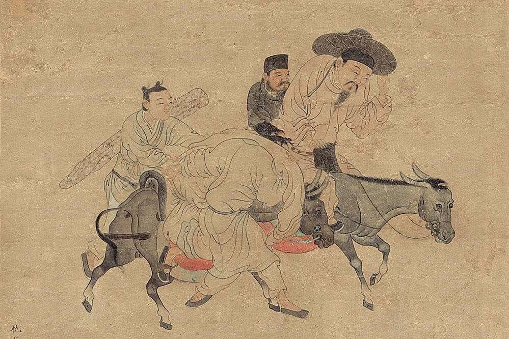 骑马或马车旅费昂贵,古人便骑驴出行,辎重过甚时采用牛车。宋代陆游从抗金前线调回成都时路遇微雨,便吟诗道:“此身合是诗人未?细雨骑驴入剑门”;明代文学家、书画家徐渭的《驴背吟诗图》,明代画家仇英的《高士出行图》等更是别具雅意,流传至今。
