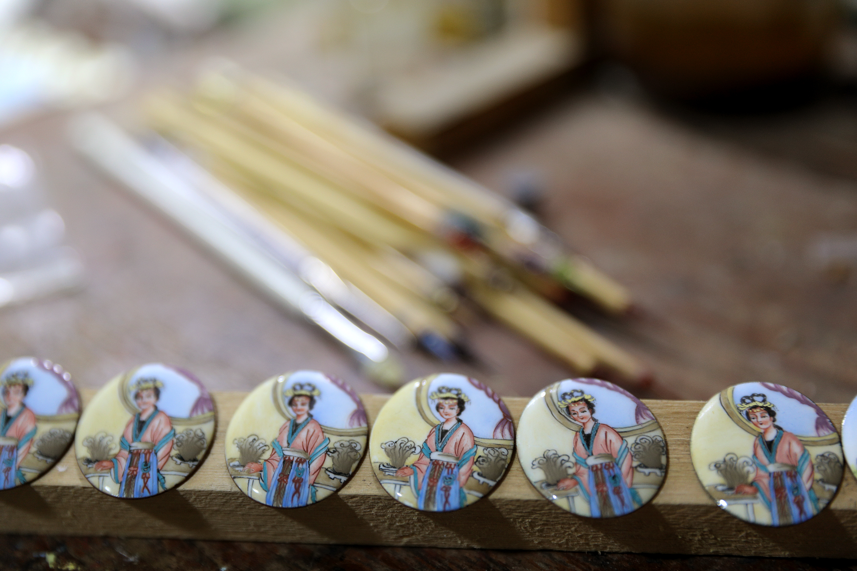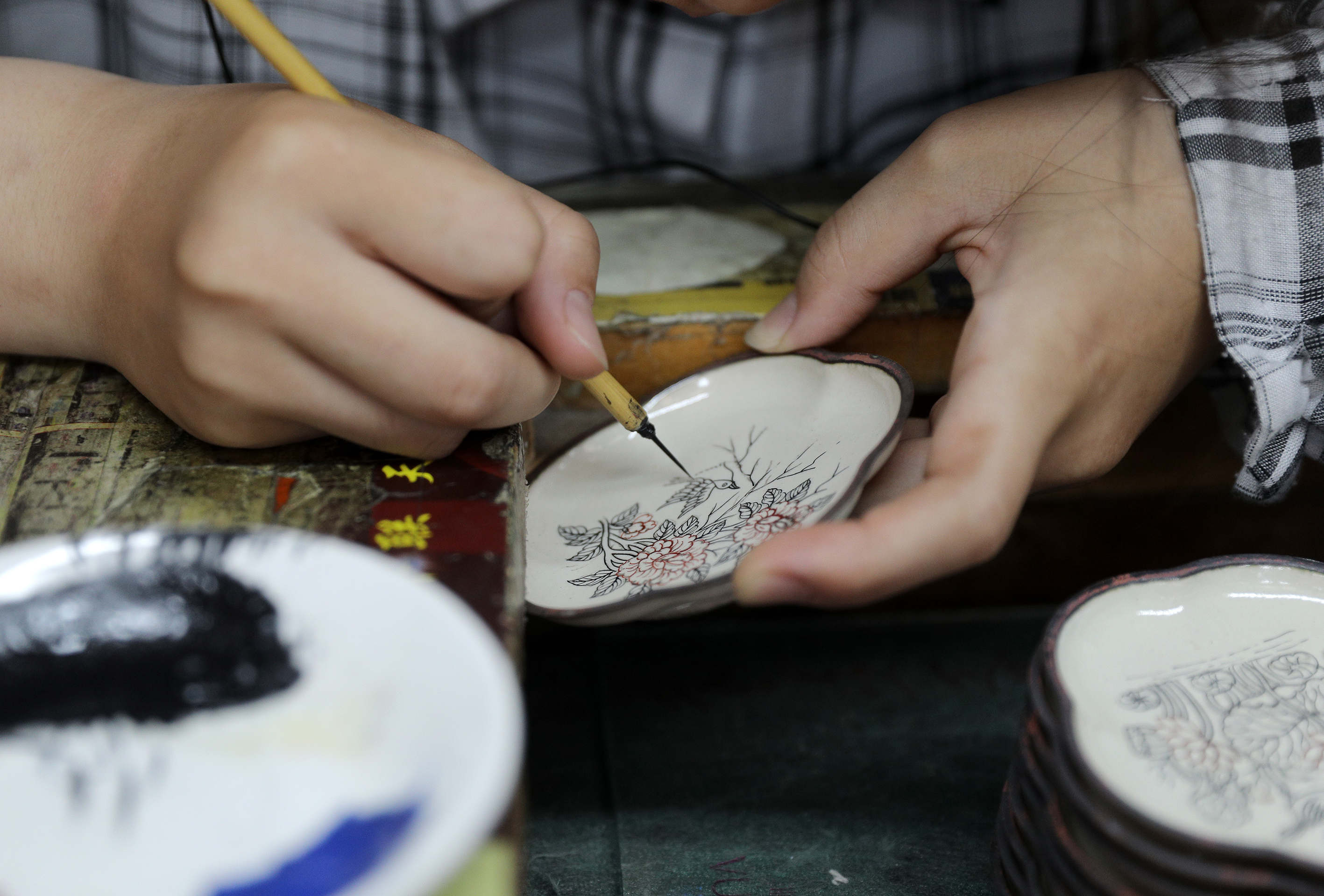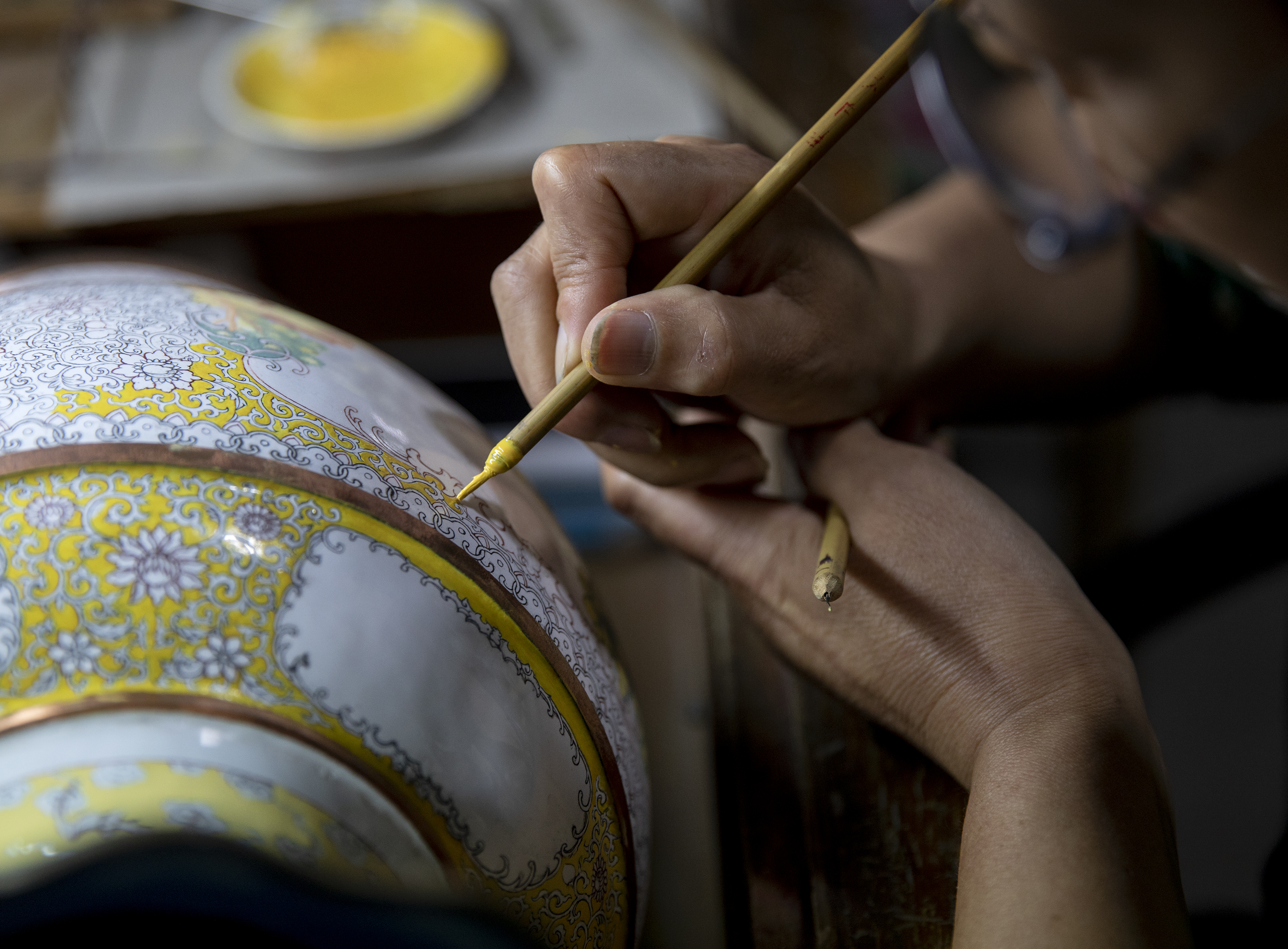 衡水市景县龙华镇铜胎画珐琅手工艺人在对作品进行彩绘。