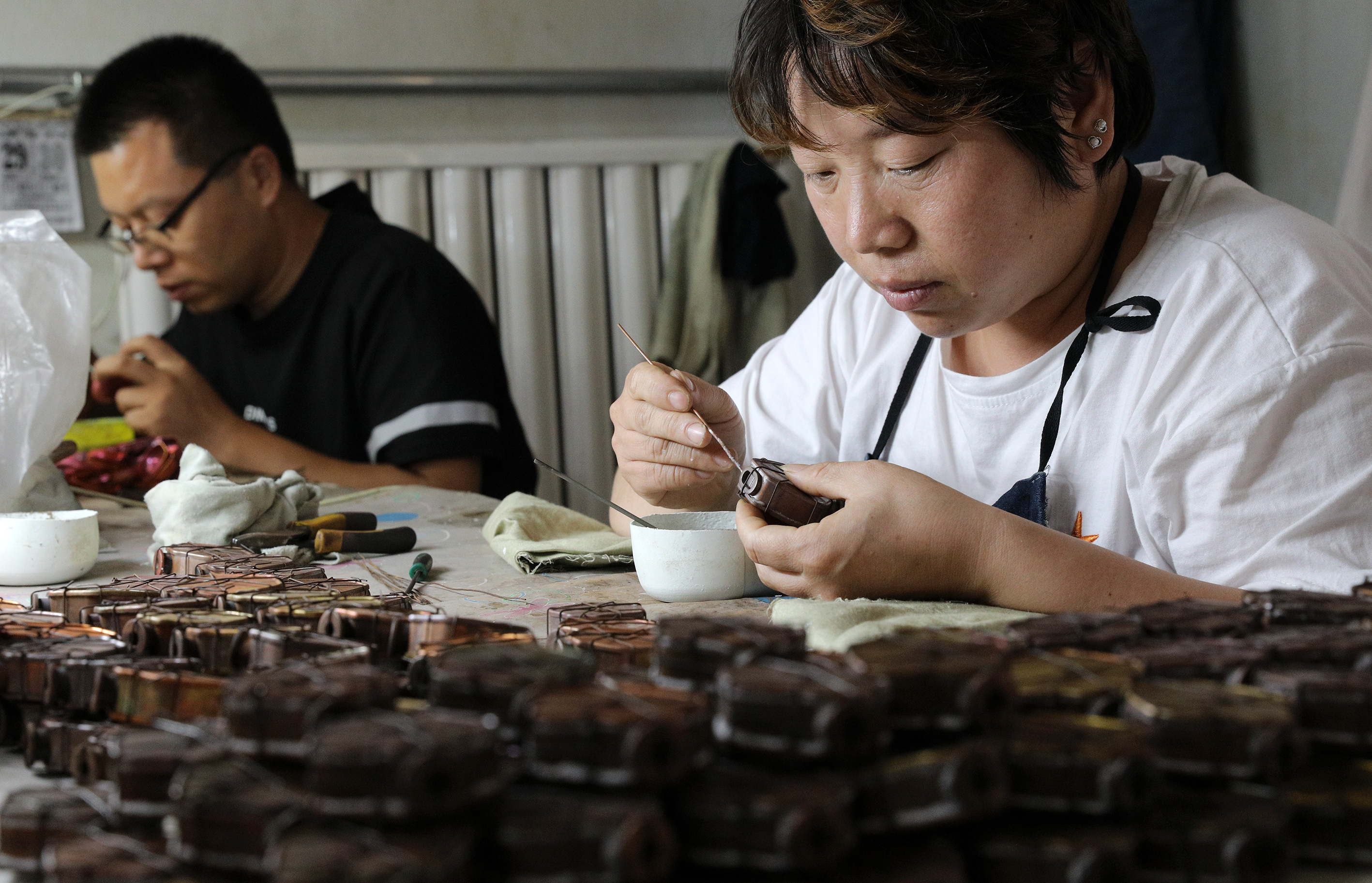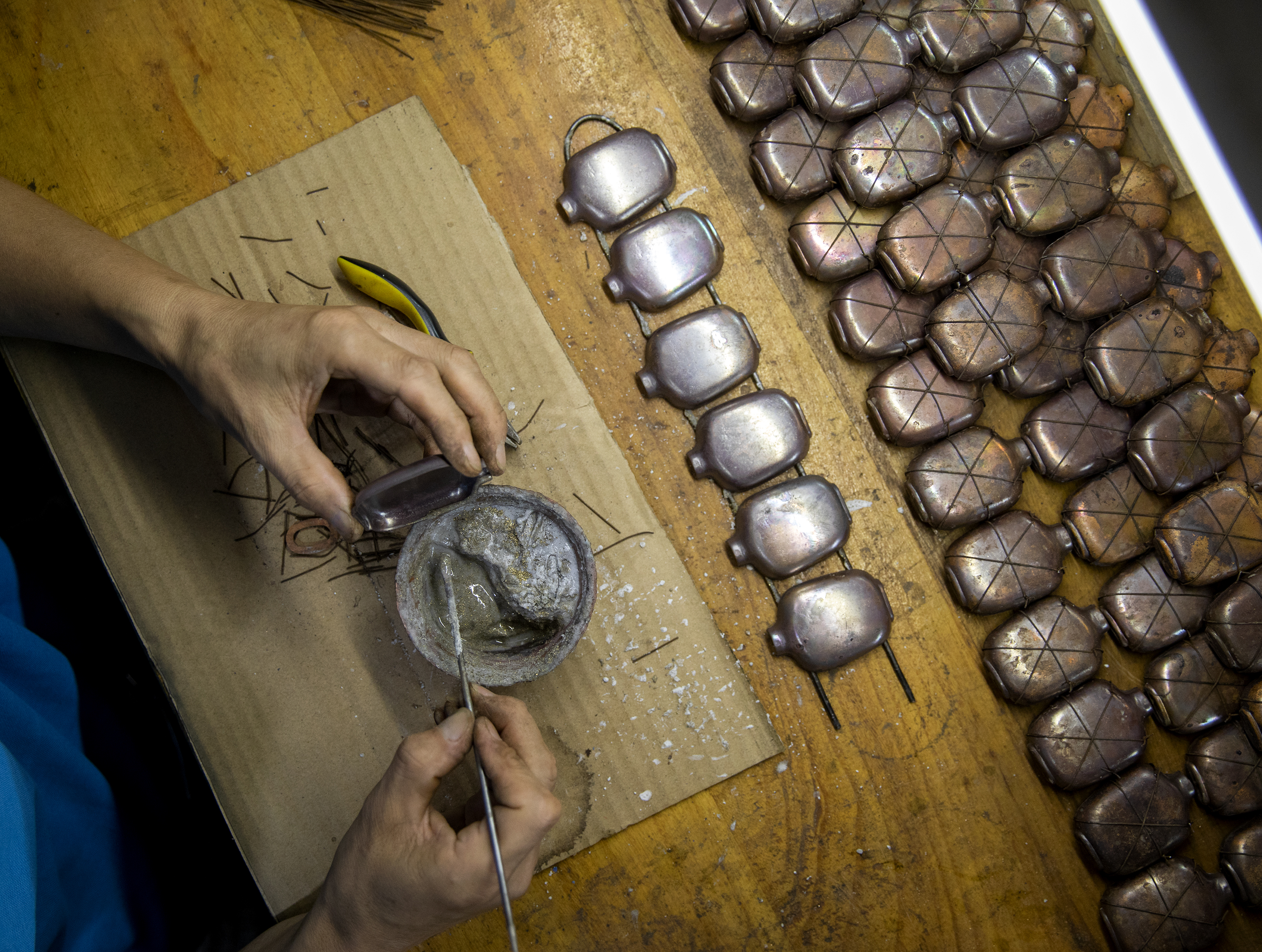 衡水市景县龙华镇铜胎画珐琅手工艺人正在粘合胎体。