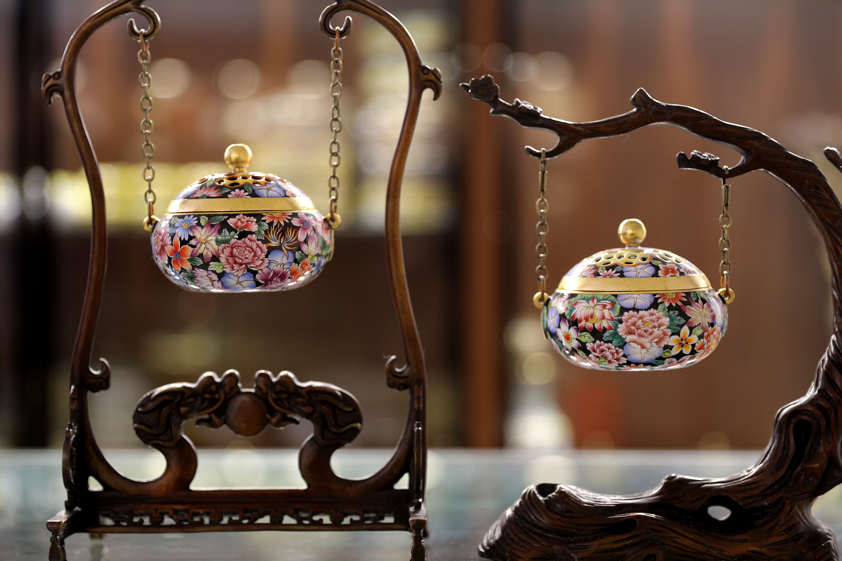 衡水市景县龙华镇铜胎画珐琅手工艺人展示成品。