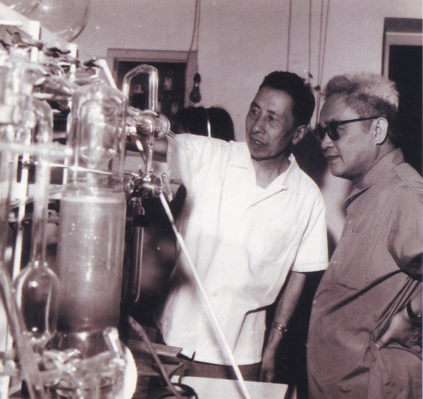 夏鼐(左)与外国学者参观考古所的碳14实验室。资料图