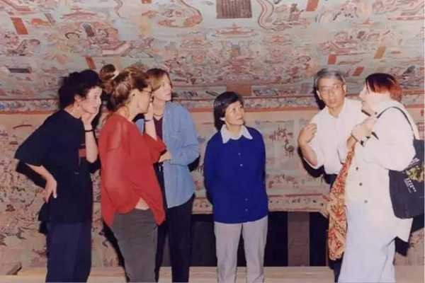 1998年,樊锦诗(左四)与外国学者探讨壁画保护方案。资料图