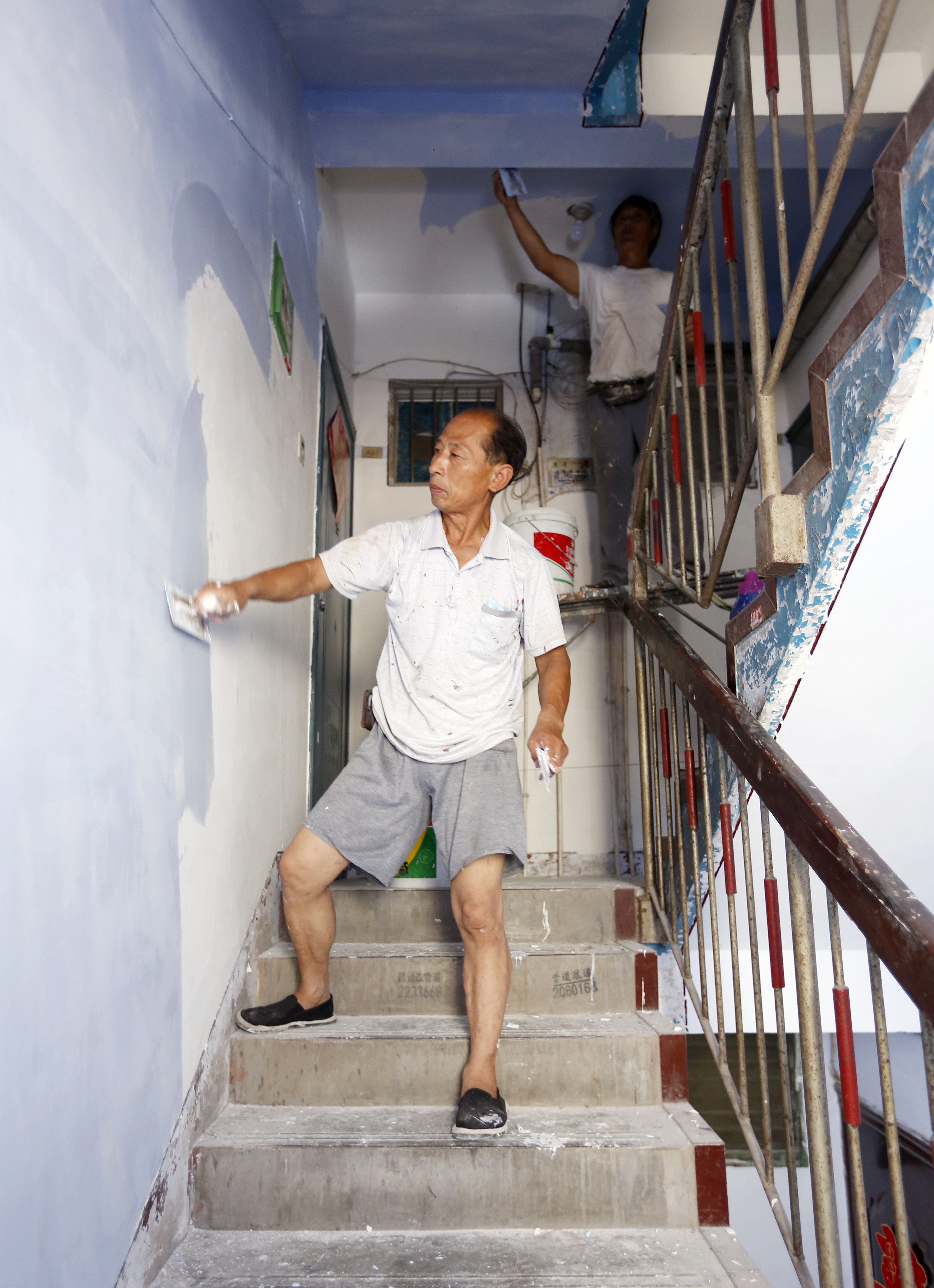 施工队正在粉刷居民楼道墙面。