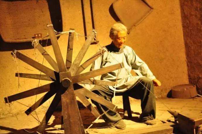 讲纺织文化,首要的离不开纺车和织布机。手摇纺车主要由支架、大转轮、传动带、摇把、捻轴等组成,平面形状像个“L”字。大转轮的木轴上装有约30厘米长的方形木棍,每边各10至12根,错落排列,用线绳呈“W”形从顶端链接。然后把两根稍粗的线绳套在上面作“传送带”,链接前边的锭杆儿。锭杆用硬木做成,两头尖,中间有个凹槽,叫“啪儿”。把“传送带”套在锭杆“啪儿”上,再把锭杆穿在两个叫做“趴头”的木板上,一摇摇把,纺车大轮转动,带动锭杆嗖嗖地转起来,就可以纺线了。