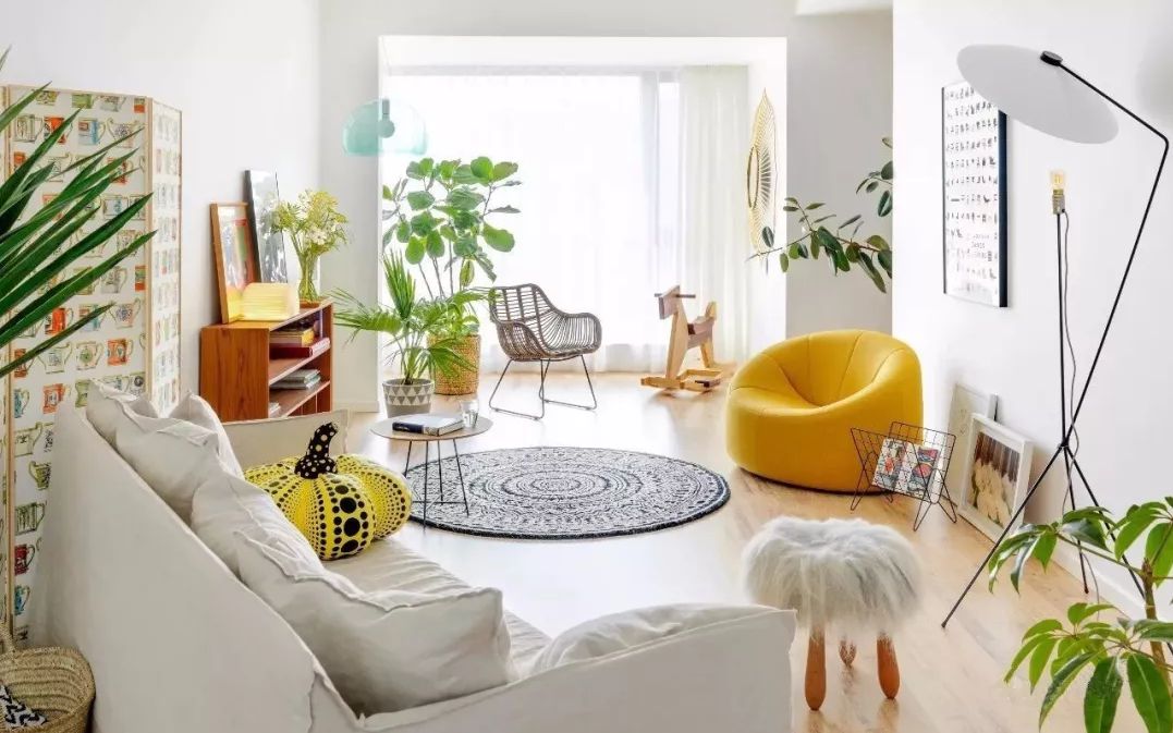 颇具民族风情的几何地毯,让这个家充满浓浓的艺术感,不同座椅上的垫子和抱枕,也在色调上与圆形地毯相呼应,从细节中展现了女神的小心思。