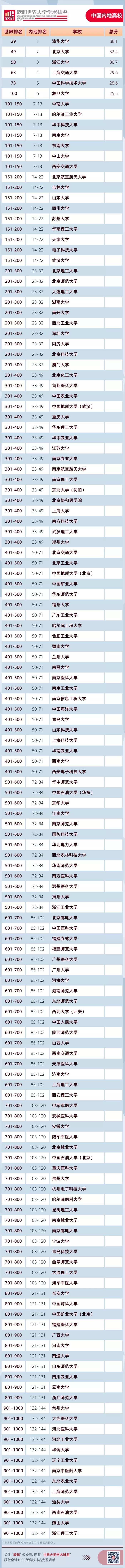 排名世界前100名的中国内地大学中,清华大学排名全球第29,北京大学名列第49,浙江大学和上海交通大学分别位居全球第58和第63,中国科学技术大学和复旦大学首次跻身全球百强,分别位列全球第73和第100。