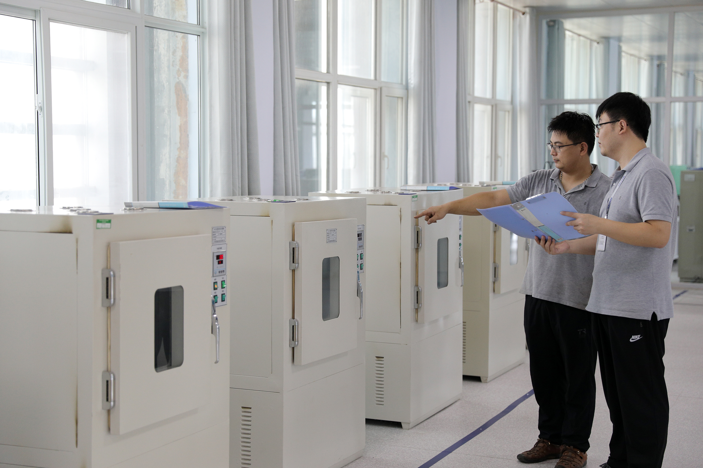 工程橡胶国检中心工作人员在做热空气老化实验。