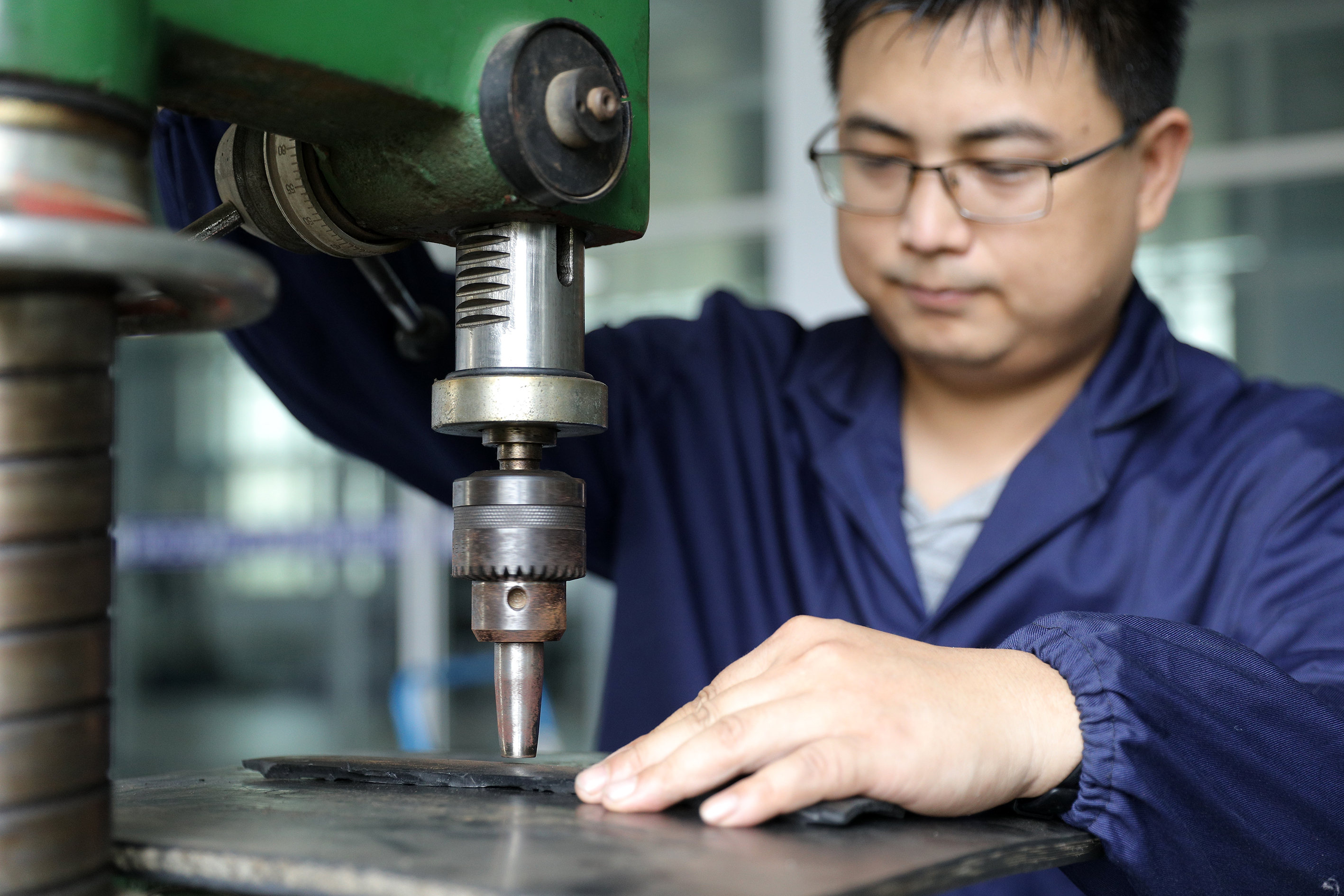 工程橡胶国检中心工作人员正在对即将进行检测的工程橡胶材料进行制样。