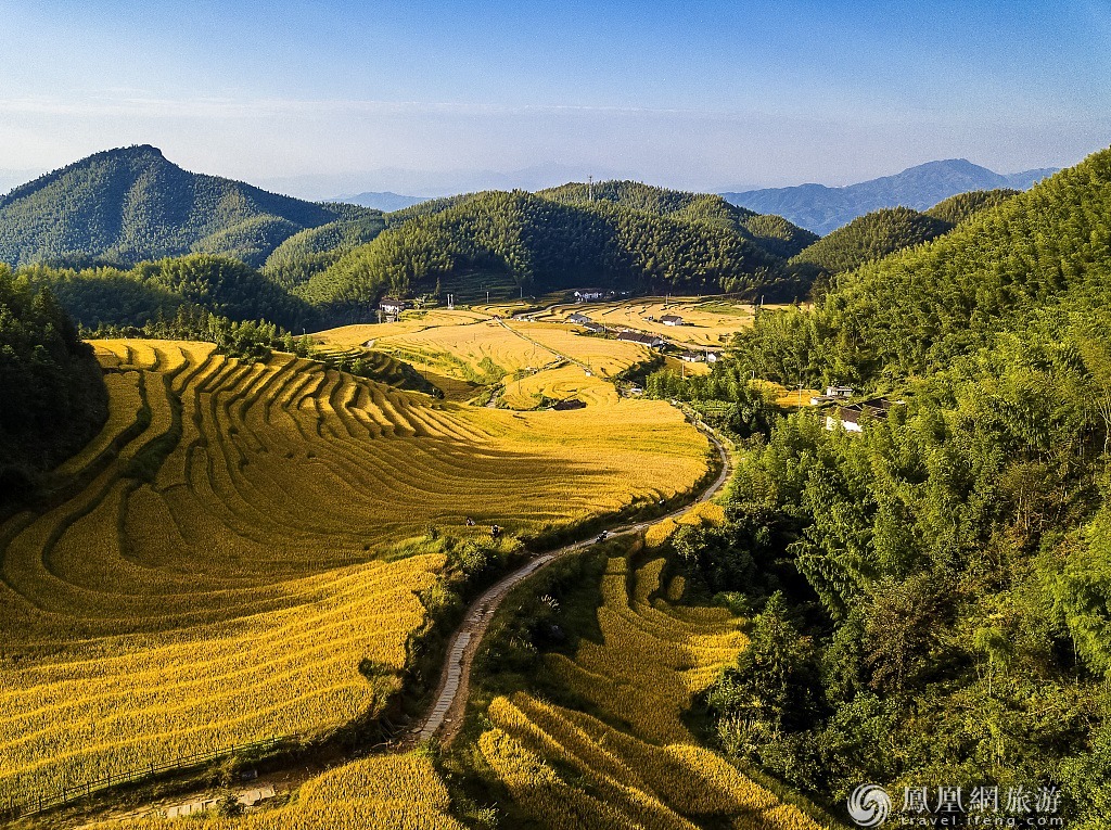 2、江西上堡梯田的金色稻海。九月,梯田里的稻子呈金黄色,在山里的劲风舞动下,飘逸起伏的稻浪,韵律般轻奏起天地之梵音,悠扬而醉人。当田里灌满了水,温暖的橙色阳光洒在水面上,层层梯田如一面面镜子嵌在大山里,流光溢彩,美不可言。