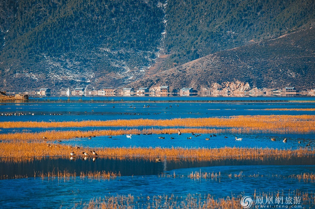8、云南纳帕海的红叶交织高原之美。纳帕海自然保护区是滇西北最大的春季牧场,秋季来临,草原一片金黄,皑皑白雪的山峰倒影于湖泊中,黑颈鹤、黄鸭、班头雁在草丛中、水面上嬉戏,给广阔空灵的草原带来了生气。