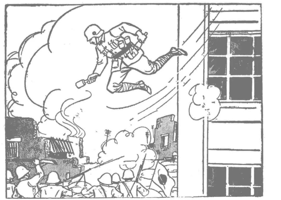 “有一个同志,很老的年纪,在身边围了七八个手榴弹,手里也拿着一个,爬到最高楼,看,看见一群敌人来了时,纵身跳下,同时手榴弹也掷了出去。敌人都死了,他自己可也牺牲了。”