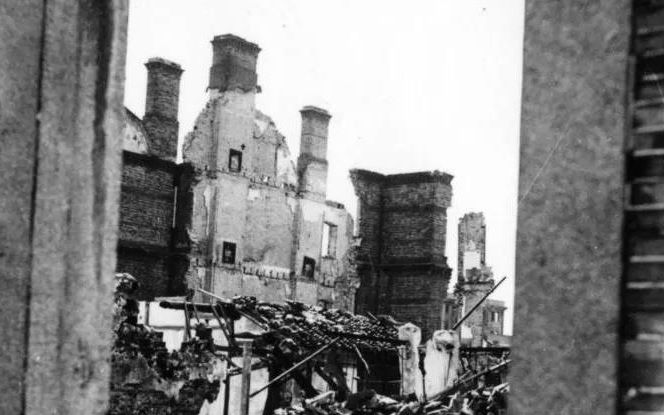 烟柱腾空而起,与低垂的乌云相接,连成一片厚重的烟墙,在残垣断壁间蜿蜒,所经之处,炽烈的火焰贪婪地吞噬着一切,将深秋十月的瑟瑟寒风化作灼人的热浪。但灰白的余烬,却如凛冬的雪花一样,带着余温,缓缓落在这片焦黑色的大地上。宽阔的街道变成了坑坑洼洼的小径,小径则被瓦砾掩埋,成了高低不平的山丘,摇摇欲圮的建筑物不时落下碎石残砖,绝望地为这片废墟添砖加瓦。