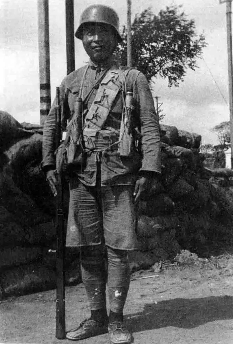 一名典型的中国士兵形象,胸前的弹药袋里放着两枚手榴弹。