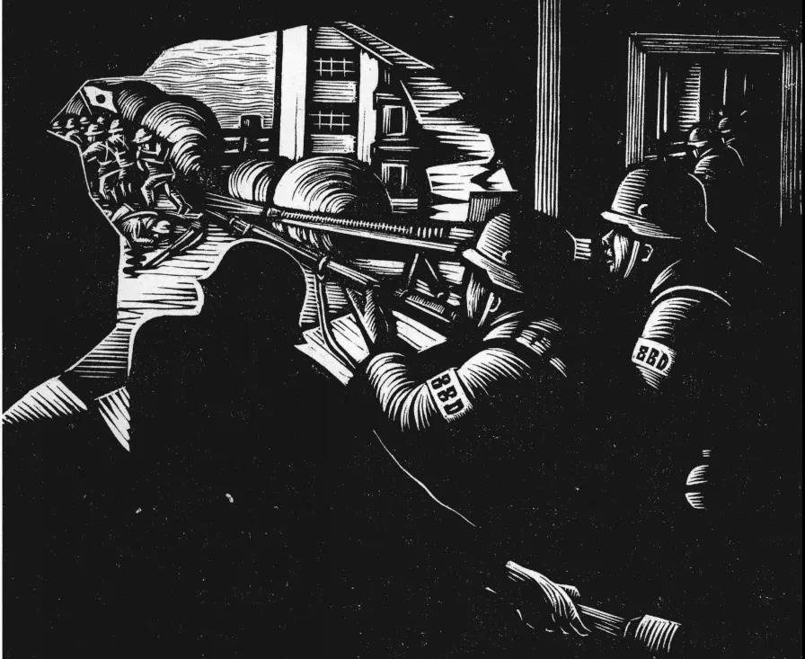 著名版画家胡一川于1938年作版画《八百壮士》