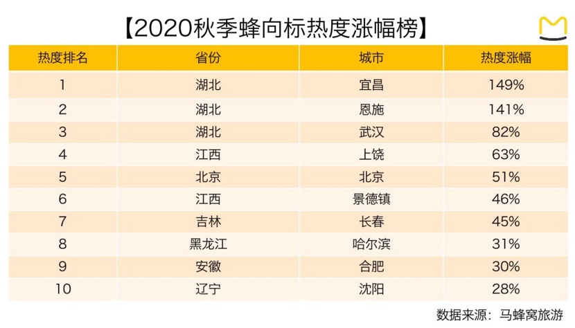 马蜂窝旅游大数据显示,湖北省宜昌、恩施、武汉三座城市在“秋季旅游蜂向标”的热度涨幅榜中位列前三。此前湖北省宣布自8月8日起,湖北省近400家A级旅游景区对全国游客免门票开放,这一活动将持续到今年年底,覆盖十一黄金周。这一活动对于疫情初期受影响较为严重的湖北省旅游起到了不小的提振作用,宜昌旅游热度自暑期以来上涨149%,恩施旅游热度自暑期以来上涨141%,此前旅游热度指数长期保持较高水平的武汉,热度上涨幅度也达到了82%。