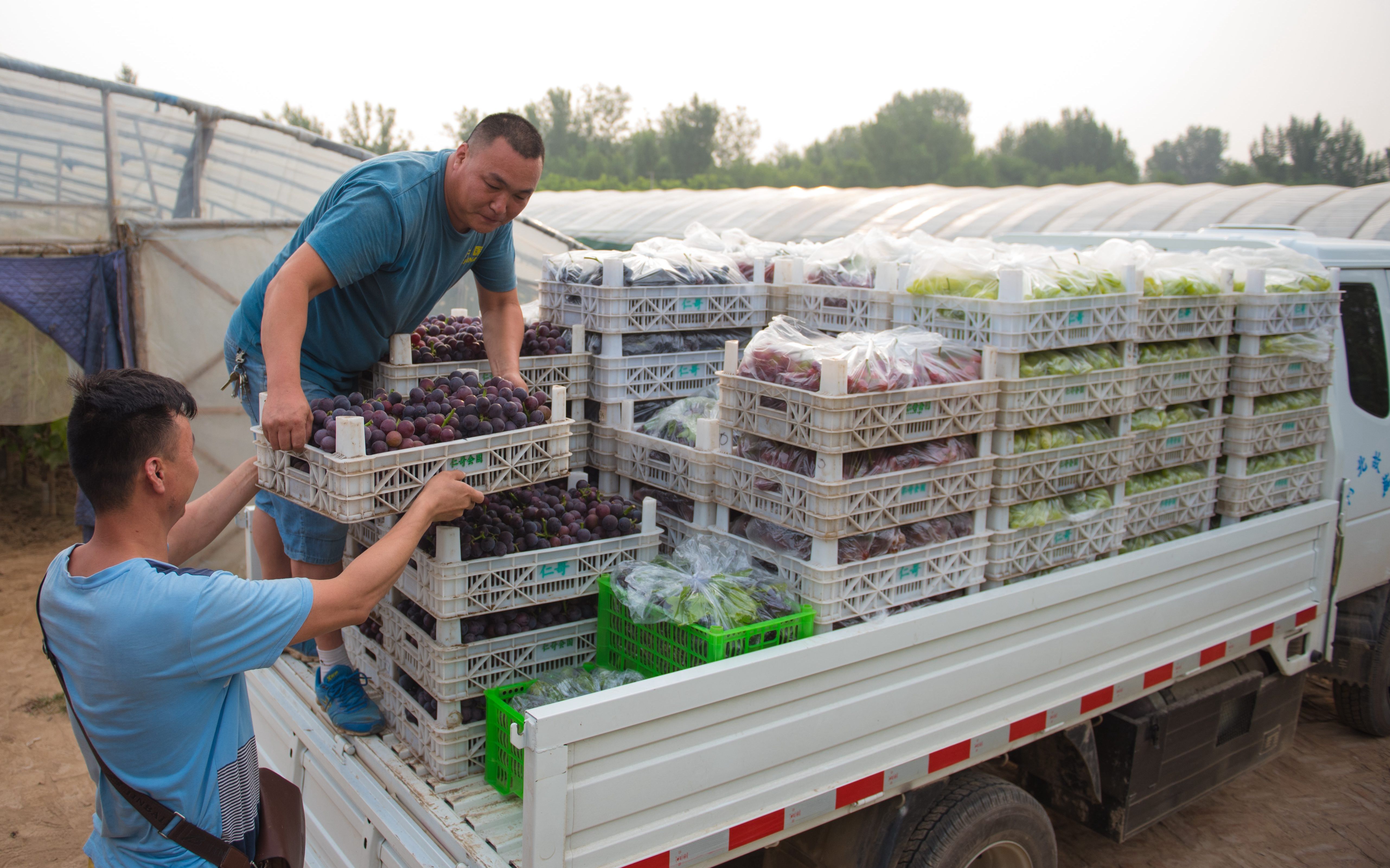 邵府村村民将葡萄搬运到水果商的收购车上