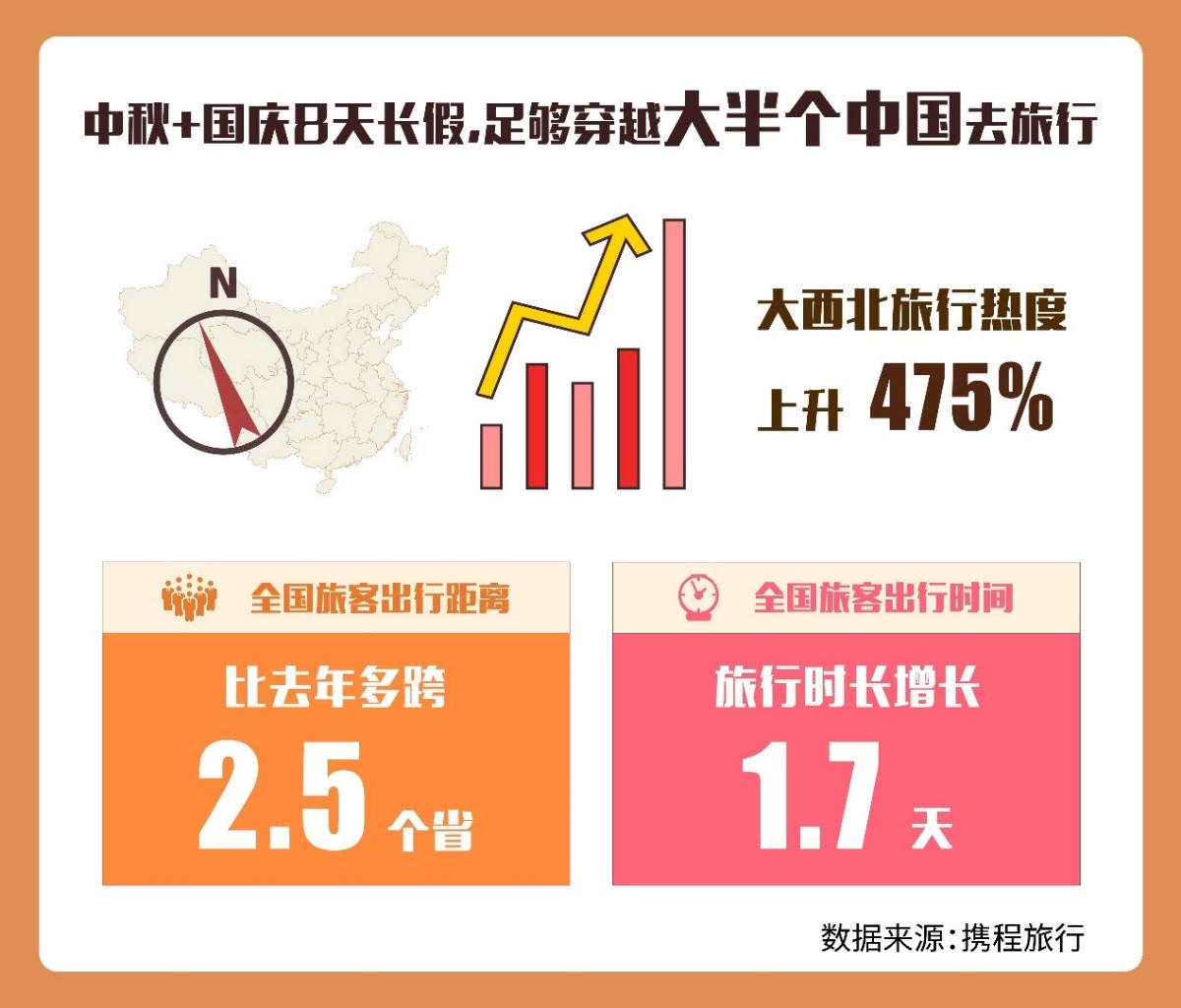 9月7日,携程发布的“2020中秋+国庆旅行指北”显示,今年国庆假期期间旅客出行时间预计比去年增长1.7天,多跨越2.5个省的距离,5天以上的国庆跨省游搜索量在增加。除传统热门目的地三亚、丽江、昆明、厦门、西安、拉萨、哈尔滨、贵阳、成都、九寨沟之外,“穿越大半个中国”成国庆旅行新趋势,“大西北”国庆热度暴增475%。