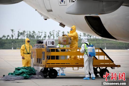 9月16日,由韩国德威航空公司执飞的波音B737-800客机搭载着60名乘客,降落在武汉天河国际机场,工作人员对旅客行李进行消杀。因新冠肺炎疫情停飞的韩国仁川至中国武汉往返航班当日正式复航,这也是自1月23日武汉天河国际机场国际及地区定期客运航班停运近8个月以来,恢复的首条国际客运航线。