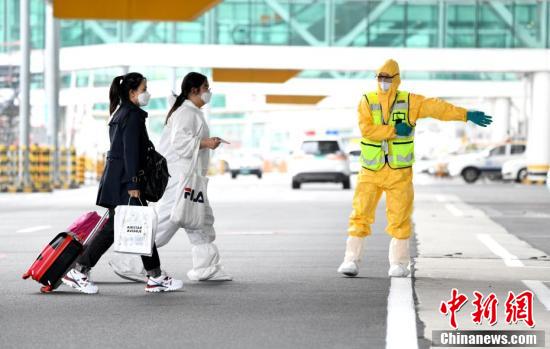 9月16日,由韩国德威航空公司执飞的波音B737-800客机搭载着60名乘客,降落在武汉天河国际机场,旅客在机场工作人员指引下进入机场大厅。因新冠肺炎疫情停飞的韩国仁川至中国武汉往返航班当日正式复航,这也是自1月23日武汉天河国际机场国际及地区定期客运航班停运近8个月以来,恢复的首条国际客运航线。