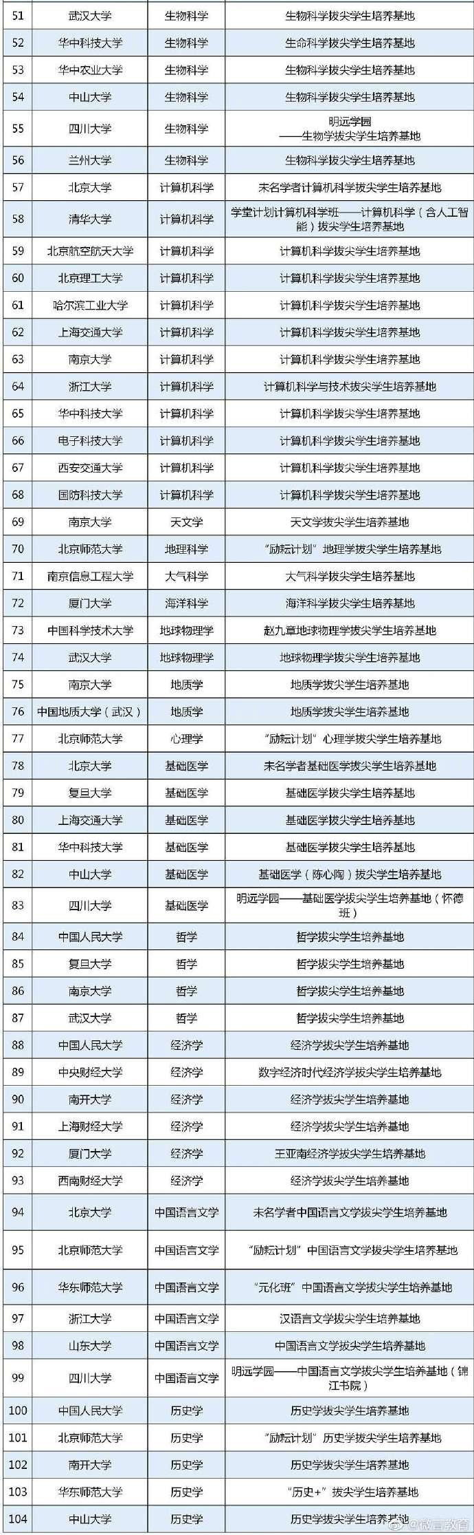 该名单包括北京大学未名学者数学拔尖学生培养基地、清华大学学堂计划数学班——数学拔尖学生培养基地、北京师范大学“励耘计划”数学拔尖学生培养基地等。具体如下: