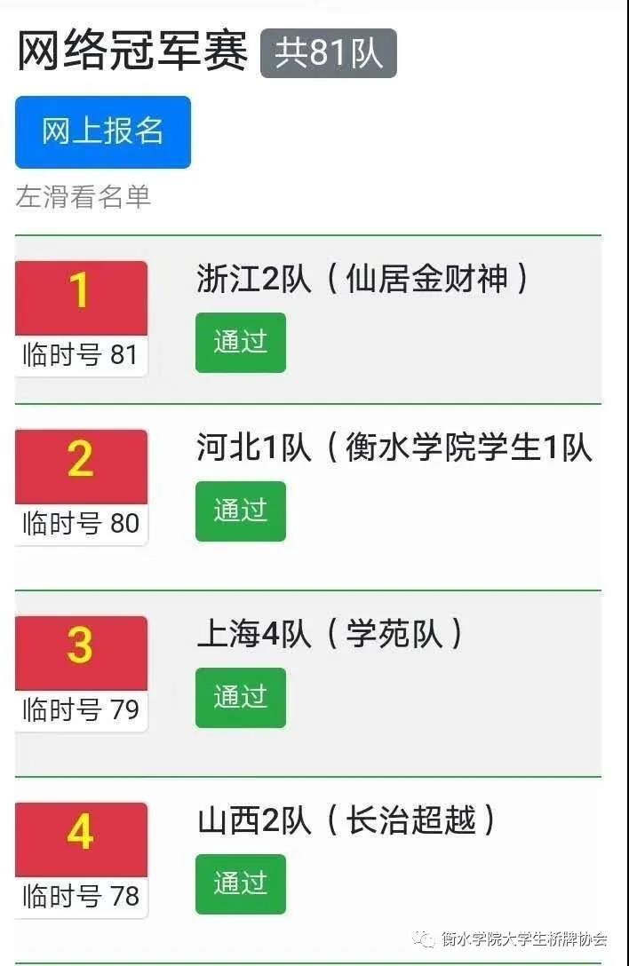 9月18日,随着2020年中国大学生网络桥牌锦标赛暨2020年世界大学生智力运动会(线上)桥牌项目选拔赛结束,衡水学院力压复旦大学、上海交通大学、中国科技大学等名校,以第四名的成绩,成功拿到代表中国参加2020年世界大学生智力运动会的门票。这是获得该项赛事资格的国内唯一一所地方本科院校。