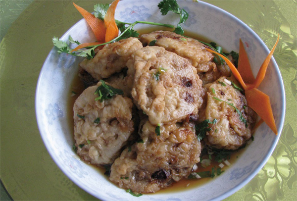 莲藕味美,李时珍在《本草纲目》一书中称其为灵根。民间传说藕孔通心,可以开心窍,安神益智,小孩子吃了聪明伶俐,老人吃了健康长寿,又有“莲藕浑身都是宝,农家筵席少不了”之说。俗话说“一莲藕,百样菜”。故城人吃藕颇为讲究,顶端藕段甜脆香嫩,切成丝,开水焯后用蒜末花椒油、醋、盐等凉拌鲜吃十分顺口。第二三段是切片热炒的上好原材料,其余各段便用来炸藕夹。故城莲藕直径不是很大,体型较细,藕孔小非常适合炸藕夹。藕夹因馅料不同分为牛肉藕夹、猪肉藕夹等,一般猪肉藕夹最为常见,制作时首先要备齐所用原料,藕、猪肉、葱、姜、五香粉、香油、面粉、酱油、水、盐等,再调馅、拌糊、做生藕夹。调馅按个人口味,猪肉切成碎肉丁,加入葱末、姜末、蒜末、五香粉、酱油、香油、盐等朝一个方向搅拌均匀(传统工艺不用料酒、味精)备用。面粉加清水、鸡蛋搅拌成糊状,为了增加藕夹的颜色可以加些许酱油在面糊里(这是故城菜肴的一大特色),搅拌面糊要干稀有度,不能太稀,稀了不容易挂糊,也不能太干,干了会使藕夹沾的面糊太多失去其鲜美的味道。放酱油的面糊炸出来的藕夹是油亮的浅红色,不放酱油的面糊炸出来的藕夹是淡黄色。接下来就是制作生藕夹了。莲藕洗净去掉两端藕节儿带根须的部分,取中间粗细均匀的藕段用玻璃片或者竹片刀刮净表皮,切成一刀断一刀不断,每两片相连的夹子形连刀片(连刀部位连得越少越好),用筷子夹少量的肉馅轻轻放入连刀藕片中,如果感觉肉馅不够多就再放两次,以免一次放馅太多撑破藕片,夹好肉馅用手略微紧一紧,使张口部位紧密——吞馅不露馅,馅料更为均匀。如此类推直到把所有的连刀藕片都夹上肉馅,便开始油炸。用大火把食用油烧得滚开,改中火控制油温,将生藕夹蘸上面糊下到油锅中炸制,等藕夹浮起来的时候,翻个再炸。火候和油温要掌握好(油温过高容易把藕夹炸糊)尽量保持藕夹能在锅中多炸一会儿,使之里外受热均匀,炸至焦香熟透就捞起来,控干油,即可上桌食用。