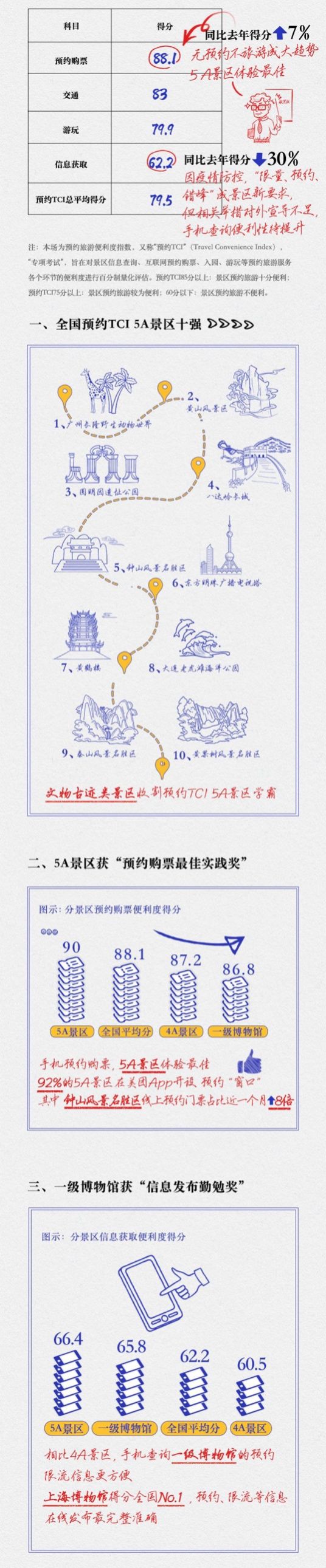 报告显示,国内景区预约TCI平均得分79.5。得益于景区尤其是5A景区关于“预约旅游”政策要求的广泛落实,手机、互联网预约购票服务便利度进一步提升。分项得分中,预约购票便利度也因此得分最高,达88.1分,相比去年得分提高7%。与此同时,今年的信息获取便利度得分仅为62.2,远低于去年。报告建议,景区及时通过官网或者第三方互联网平台将信息准确、完整地对外公布,避免线上线下信息不对称。