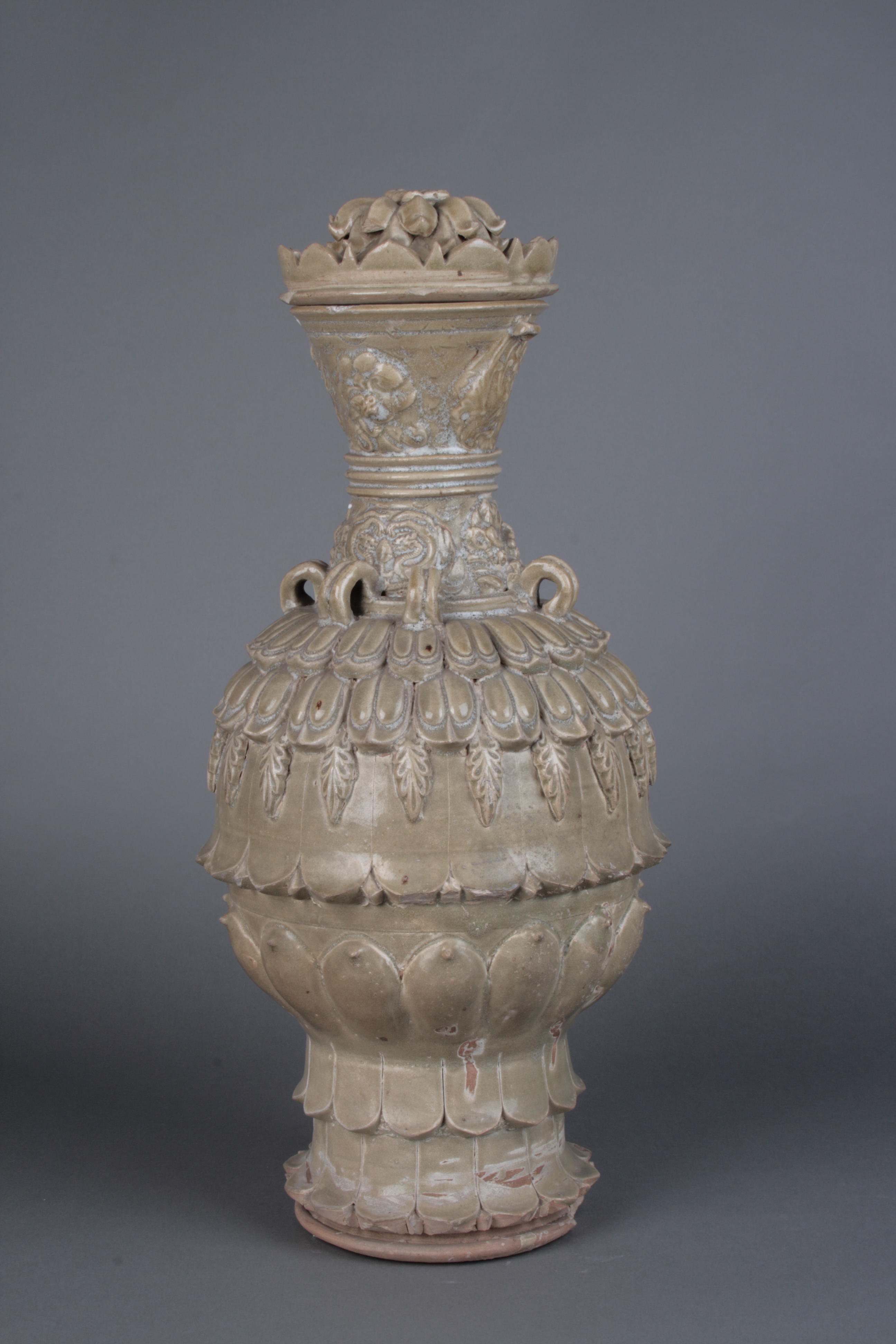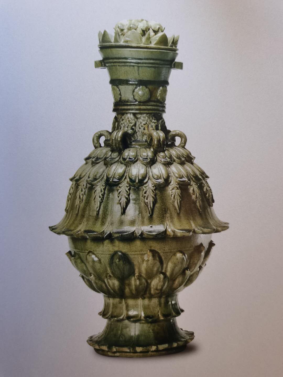 河北省博物馆馆藏青釉仰覆莲花尊,口径15.1厘米、底径18厘米、高54.4厘米,喇叭口、长束颈、椭圆形腹、圈足,颈部堆贴花卉、团龙两层纹饰,间以三道凸起弦纹, 肩部饰六个双环形系,腹部饰仰覆莲瓣纹,胫部为两层覆莲。