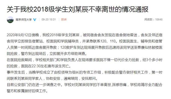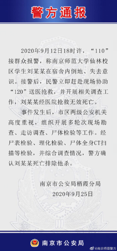 2020年9月12日18时许,“110”接群众报警,称南京师范大学仙林校区学生刘某某在宿舍内倒地、失去意识。接警后,民警立即赶赴现场协助“120”送医抢救,并开展相关调查工作,刘某某经医院抢救无效死亡。事件发生后,市区两级公安机关高度重视,组织开展多轮次现场勘查、走访调查、尸体检验等工作。经尸表检验、理化检验、尸体全身CT扫描等检验,并综合调查情况,警方确认刘某某死亡排除他杀。