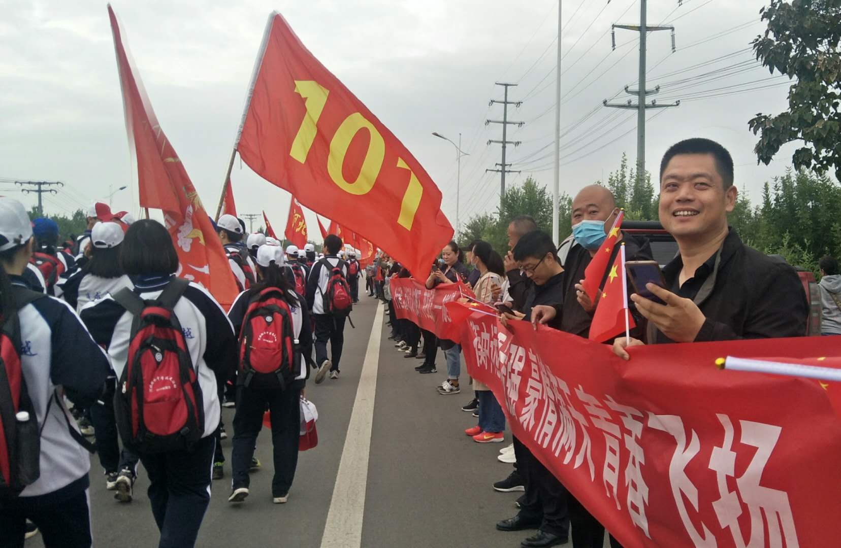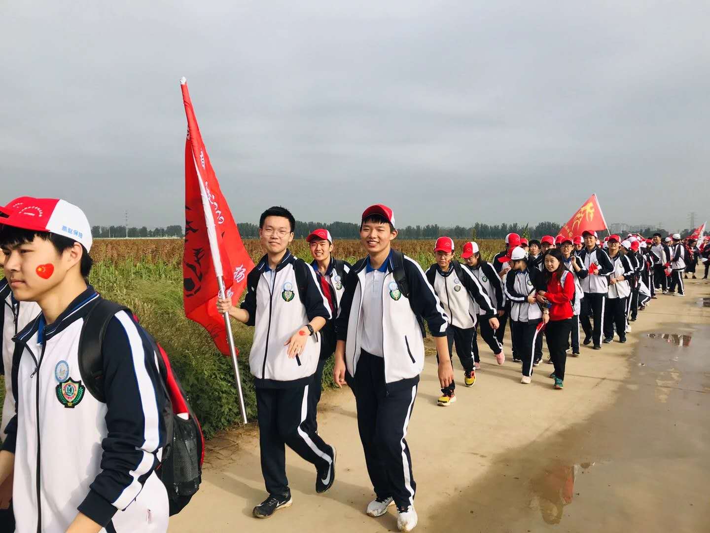 他们迎着朝阳,穿过城市和农村,越过田野和陡坡,徜徉在开满鲜花的衡水湖健步路,最后欢呼雀跃地奔向衡水湖畔的宿营地,挥舞着国旗高唱红歌。9月30日,衡水中学高二年级师生开展80华里远足活动,用青春的足迹和歌声向祖国献礼。