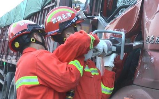 救援人员到达现场后,经现场勘查,发现追尾货车驾驶室车门变形,前挡风玻璃破碎,驾驶室正前方被撞扁,造成驾驶员双腿被卡在方向盘以下无法脱困。根据现场情况,指挥员立即下达救援命令:一是立即在事故现场周围设置警戒锥,引导过往车辆,保证现场救援秩序,防止过往车辆再次发生事故;二是立即成立救援小组,在保证被困人员不受到二次伤害的前提下,利用液压机动泵、液压扩张器等工具对驾驶室车门进行破拆。在打开车门后,救援人员进入驾驶室,通过调整座位位置和方向盘轴承,将被困人员成功救出,交由现场医护人员救治。