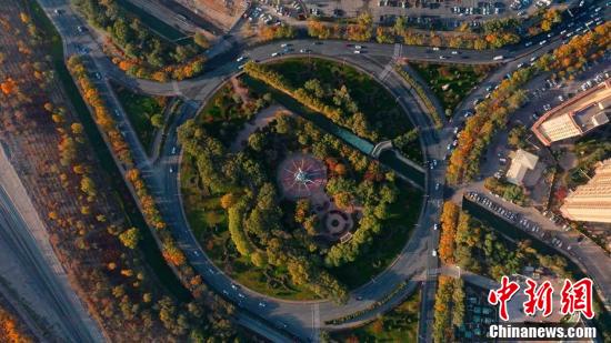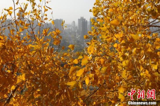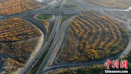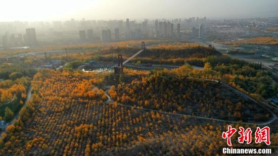 金色的胡杨、五彩斑斓的树木、曲曲弯弯的立交桥、落日时分的余晖与城市建筑交相辉映、美不胜收,成为市民休闲、健身的好场所。