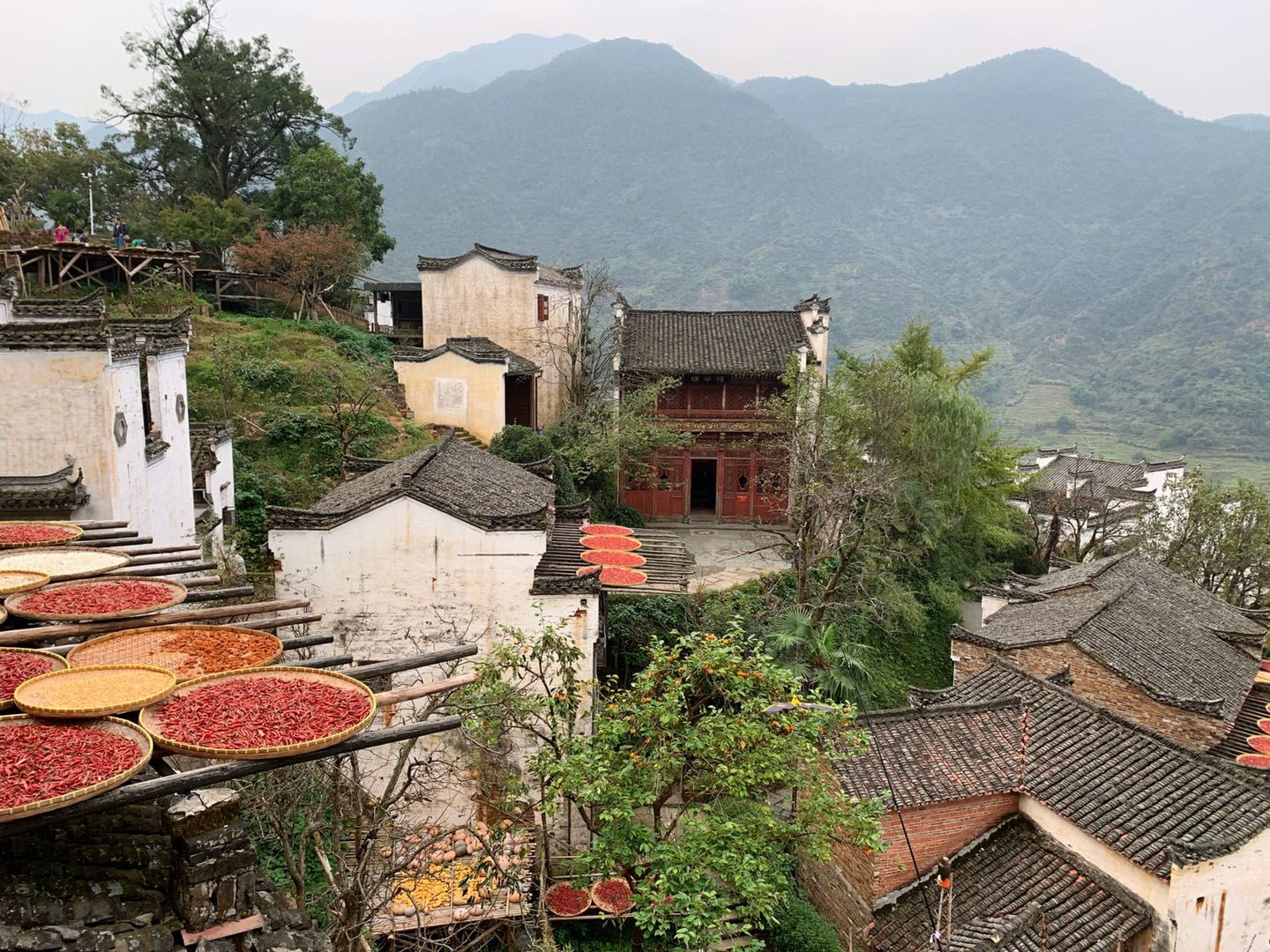 而晒秋则是篁岭秋季体验的关键词——夏秋之际,村民们在屋顶搭起竹匾,晾晒各种食材,比如笋、豆角、辣椒等。其实,晾晒农作物是常见的农俗,在湖南、安徽、江西等山区都有。但由于篁岭“地无三尺平”,村庄平地极少,屋顶成了晾晒农作物的主要场地,红红火火,分外妖娆。