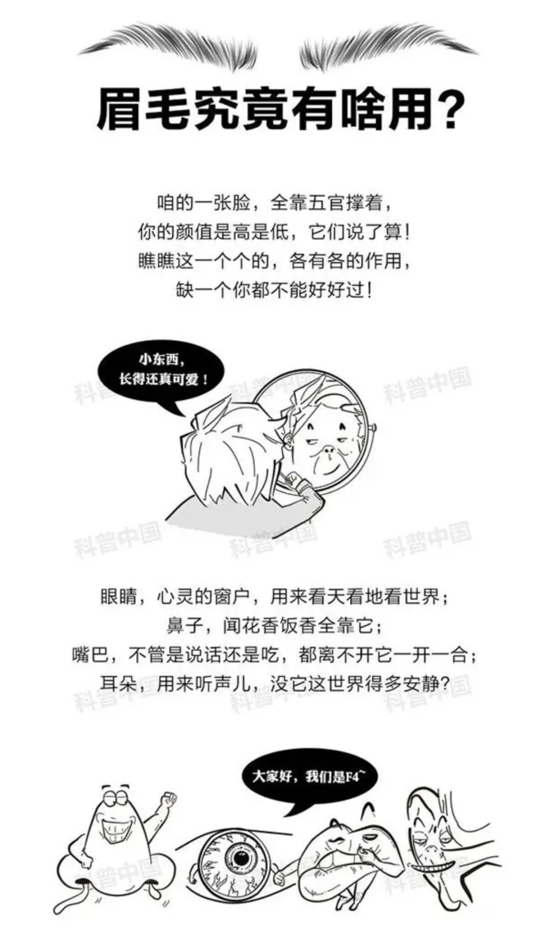 其中,眼睛可以帮我们看世界,耳朵可以听声音,嘴巴能说话和吃饭,鼻子的作用是区分气味。那眉毛是干什么的?