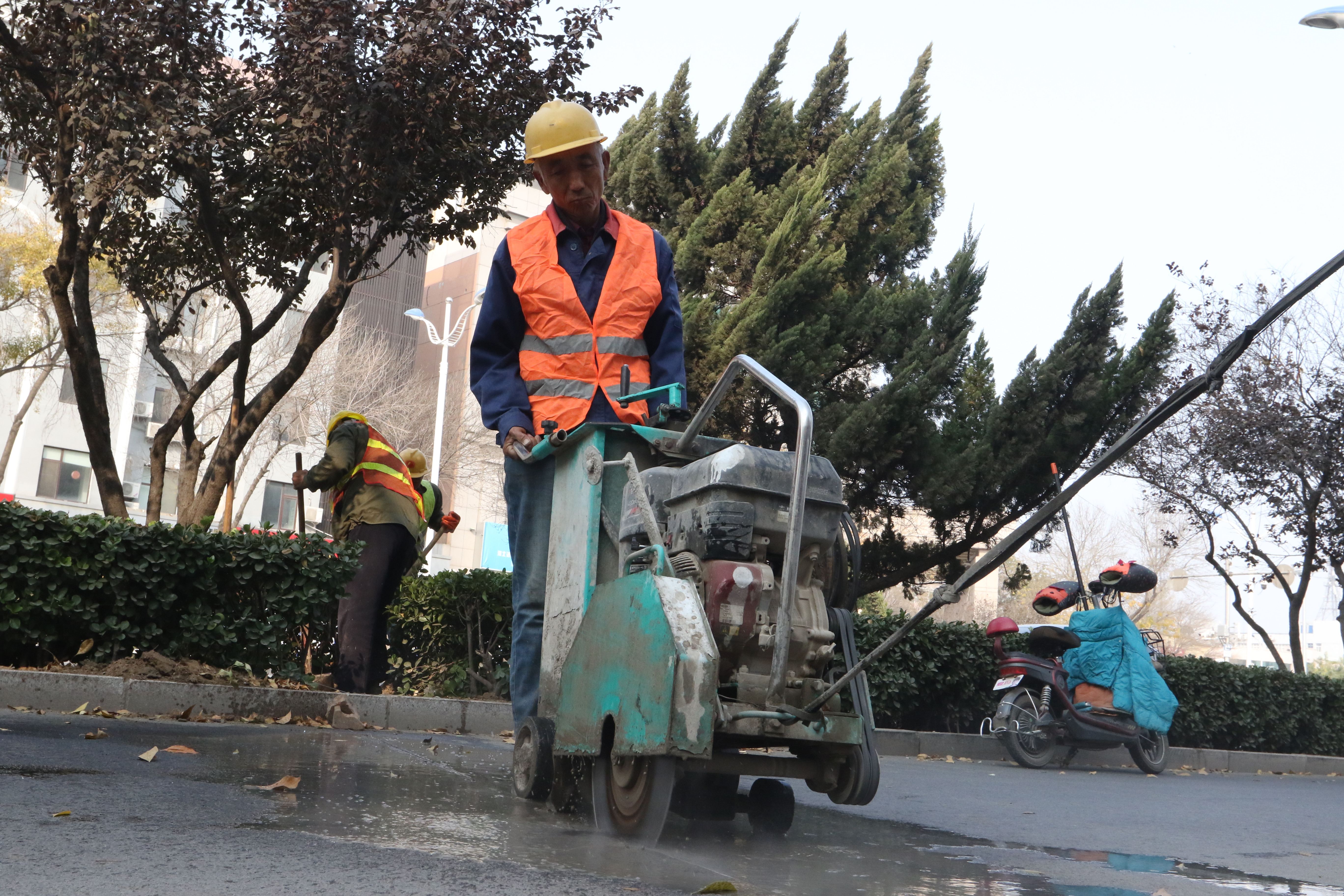 施工人员在中心街切割路面。