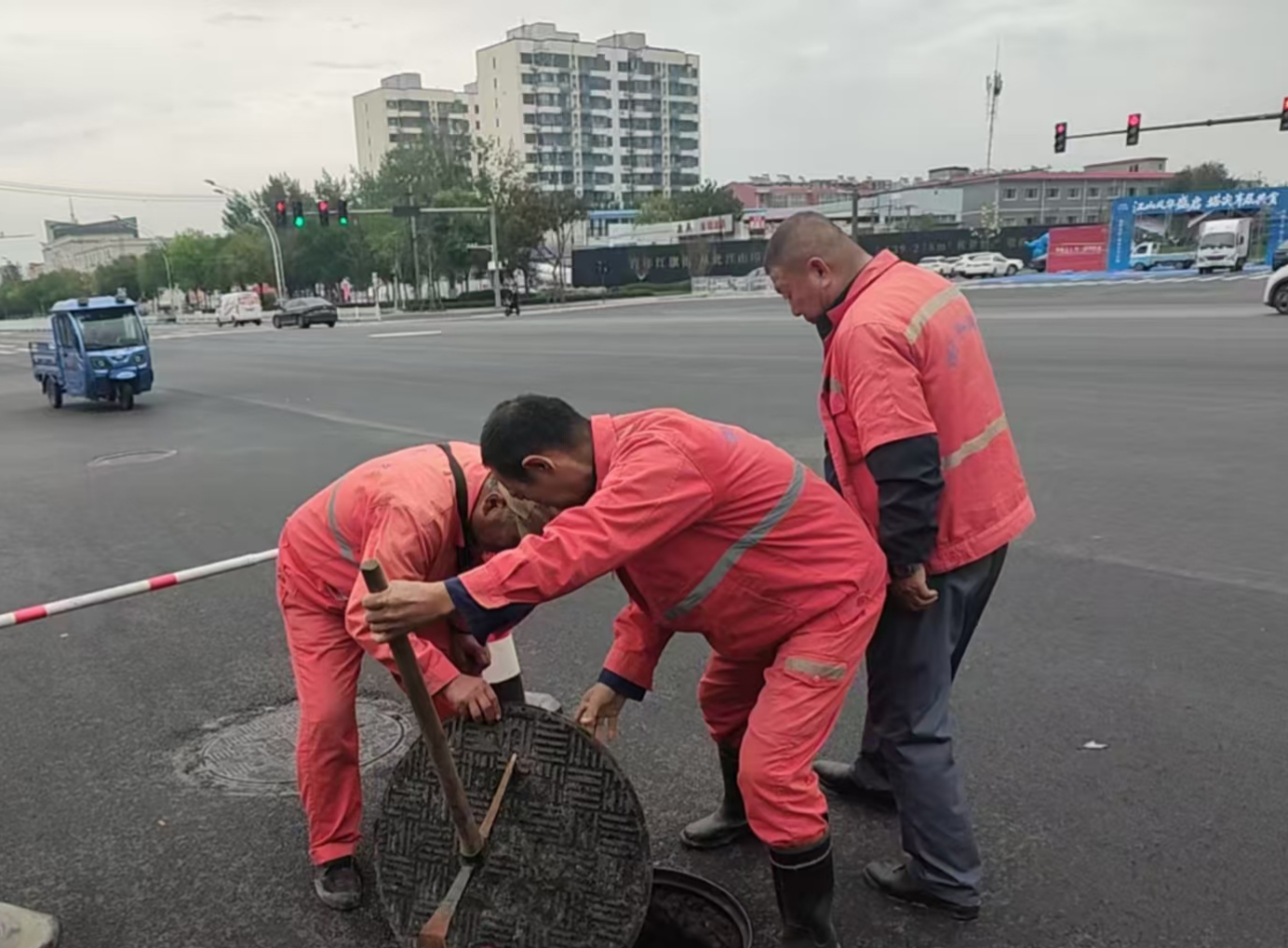 红旗大街雨污分流进入填平阶段,施工人员正在进行填平作业。