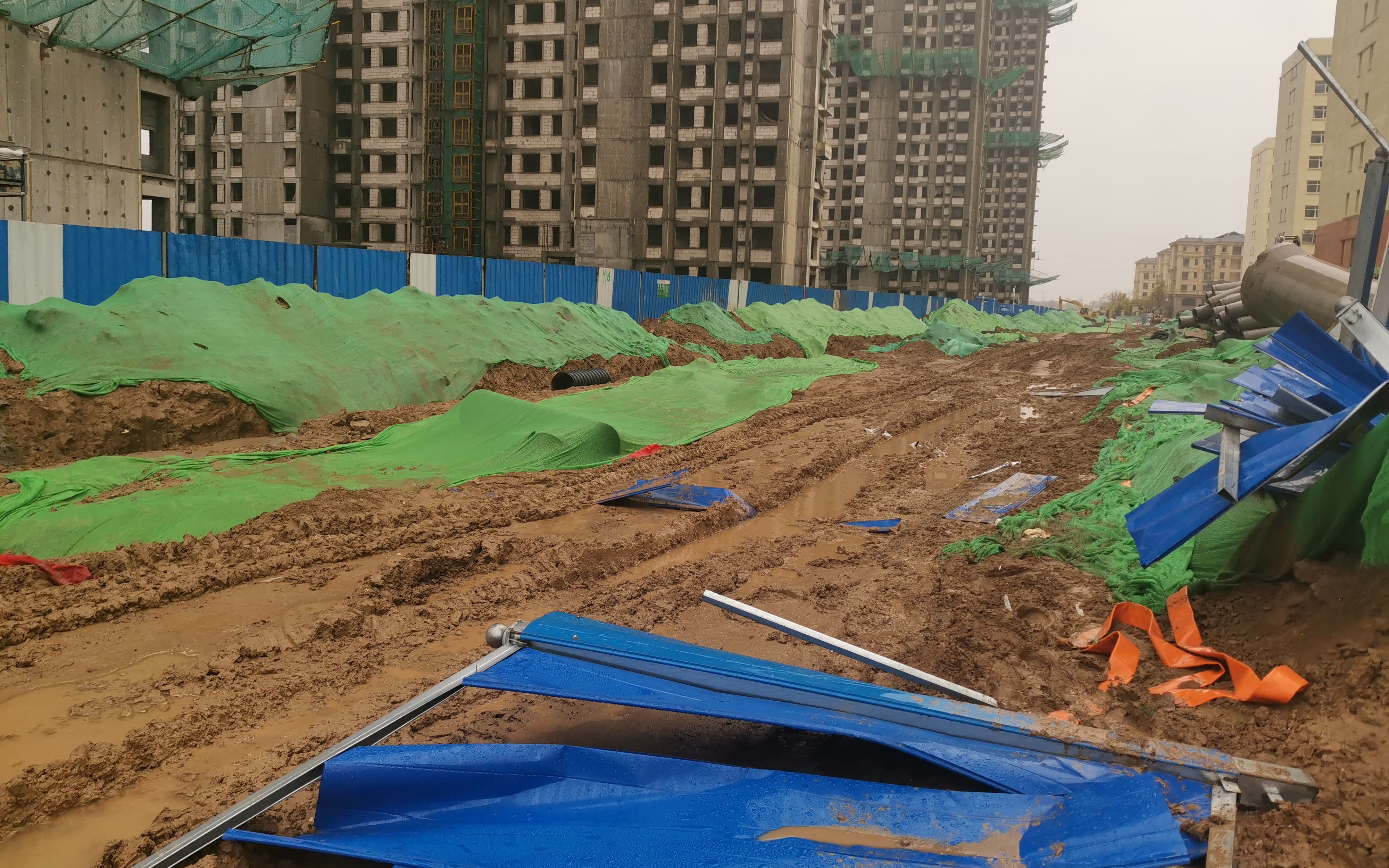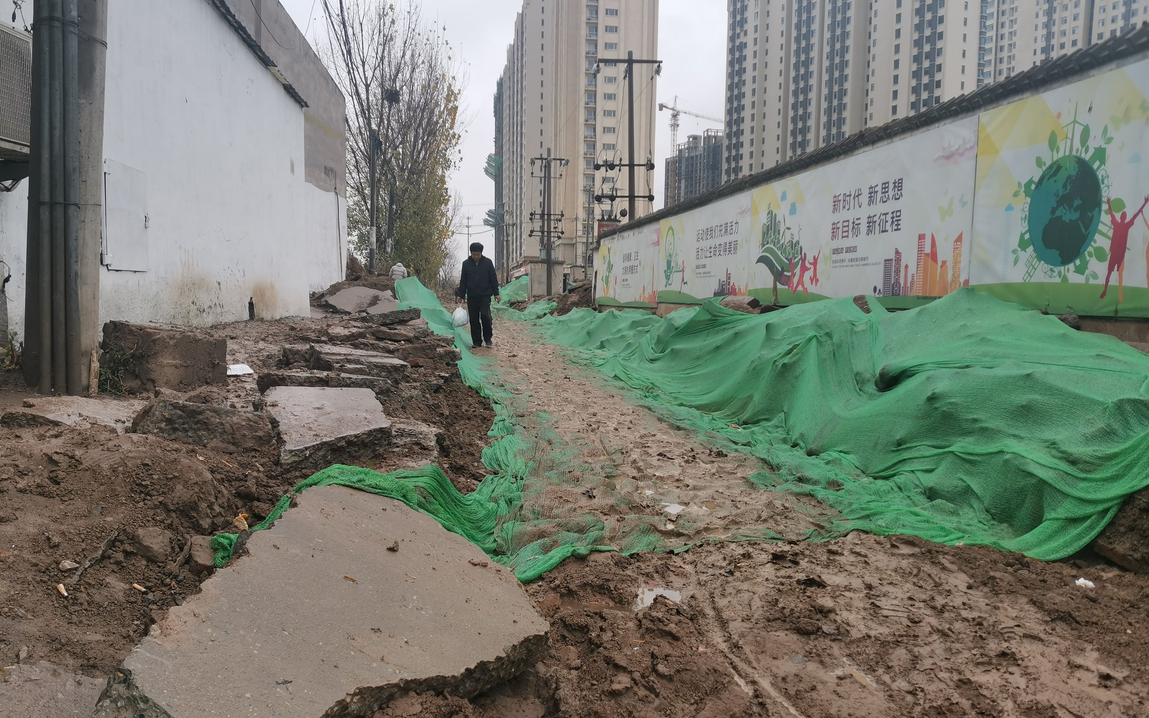 居民曹先生说,小区有北门、南门两个门口,就在两三个月前,两个门口前的道路同时施工,北门口被挖出了深坑,行人只得勉强通行。而南门口则临时开辟了一条土路,路面坑洼不平,只要有车辆经过,便会带起厚厚尘土,行人只能往两侧避让。如今受下雨影响,南门口成了泥潭,居民更是出入不便。