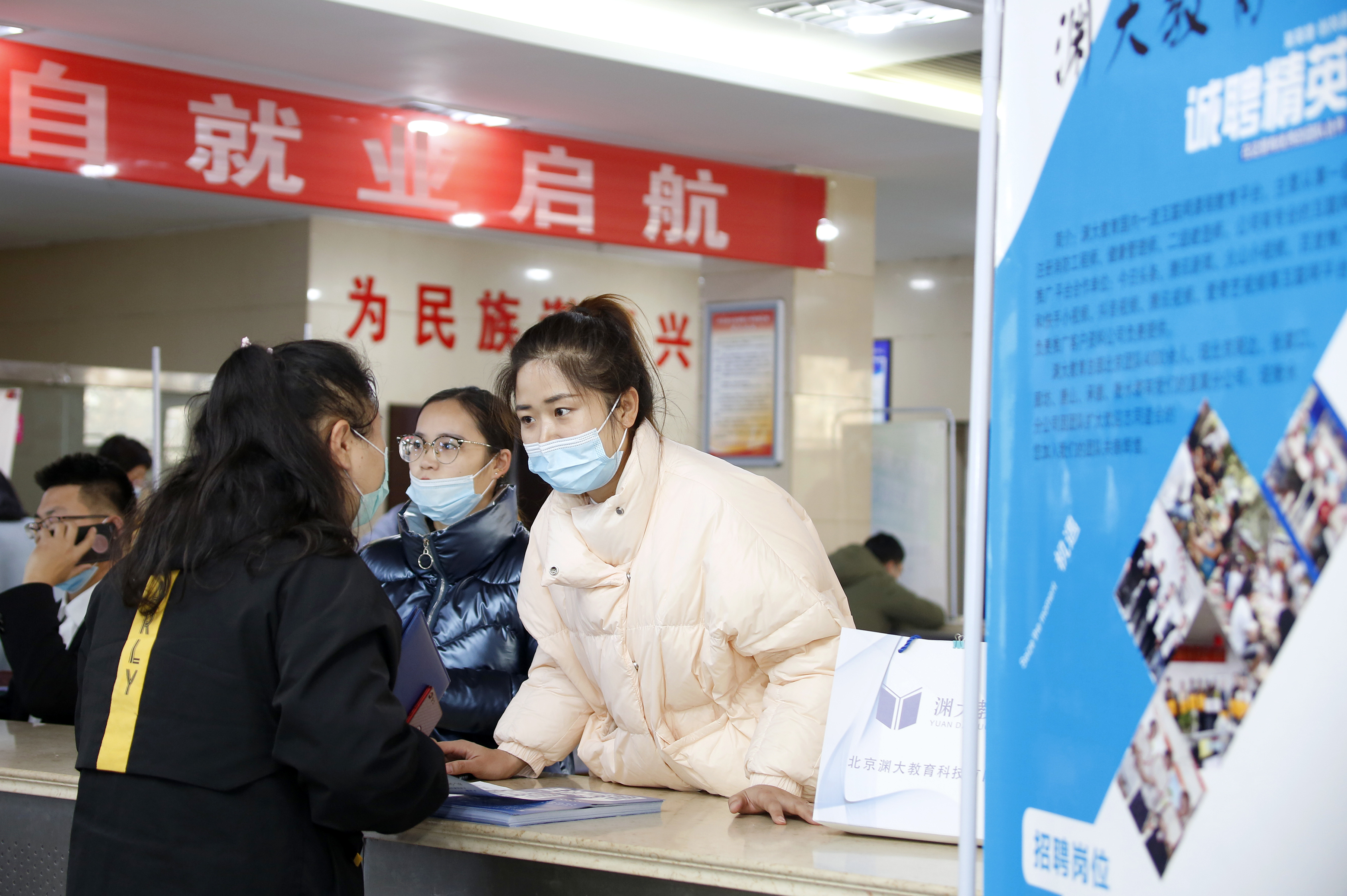应聘者在渊大教育展位前咨询相关岗位要求。